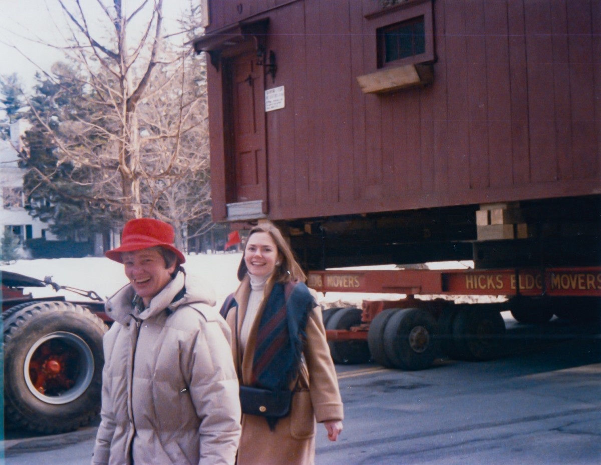 NRM Archive Photo: 1986, Board President Lila Berle and Director Laurie Norton Moffatt escort the move of Norman Rockwell's art studio from the backyard of his former home to its new location on the Linwood Estate where the museum was later built.