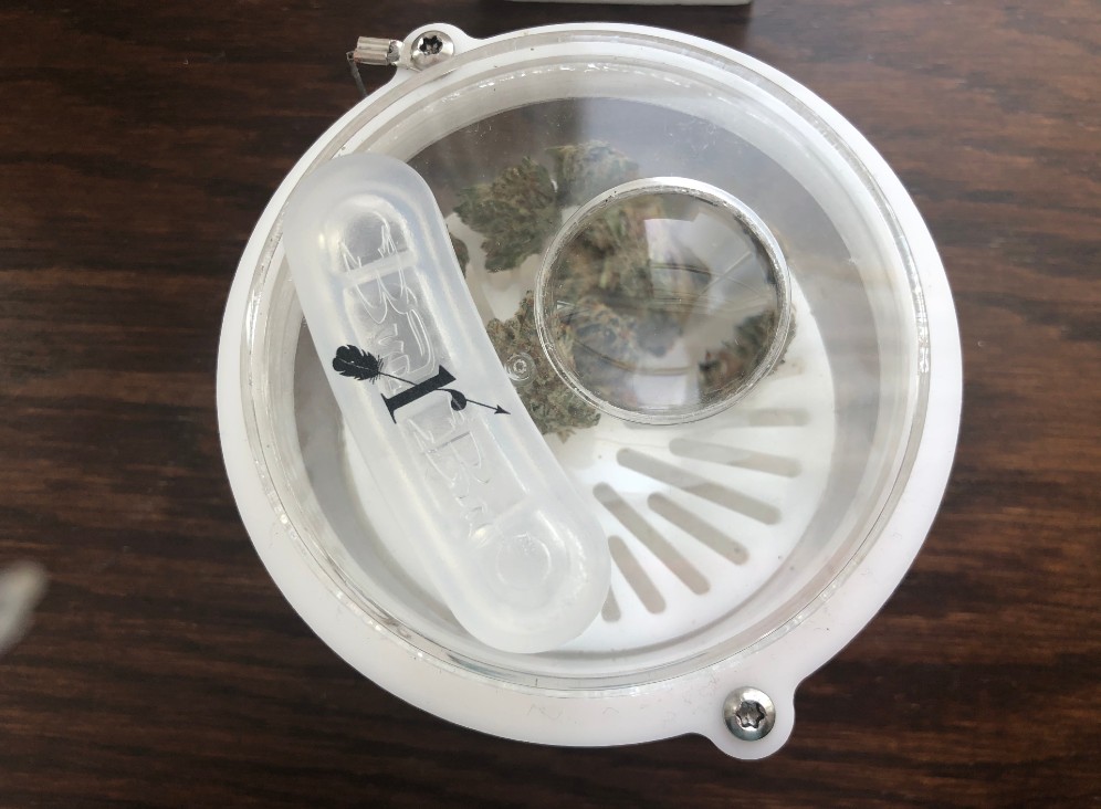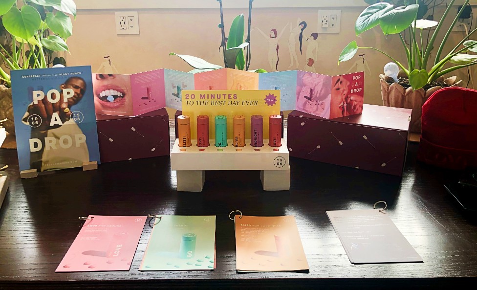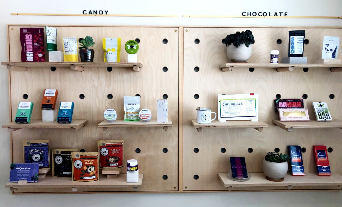 The displays are sophisticated and inviting, and while the packages on them are empty, you can get pretty close to the actual flower: Along the length of a windowsill, a row of transparent jars with a magnifier on the top allow the customer to smell and examine the many varieties of weed. A tableau devoted to 1906, a line of edibles “with delicious, fast-acting experiences” looks more like a cosmetics display than anything else (complete with chic marble and brass rolling trays for sale).