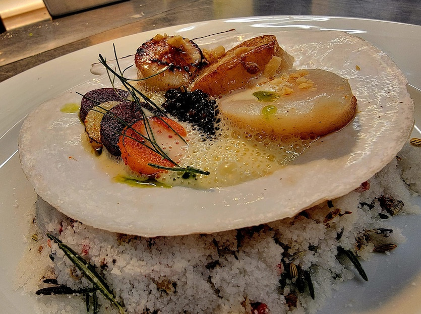 Scallops, kaluga caviar, puprle sweet potato, crispy Brussels, beaurre blanc, toasted hazelnuts