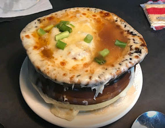 The Boathouse in Lakeville has a seriously diverse menu: there’s the raw bar, sushi, and seafood, as well as barbecue and prime rib. But the “famous French onion” is the very first item on the menu for a reason. It starts with a bone-and-root-veggies beef stock simmered overnight, infused with sherry wine, then loaded with Parmesan and Swiss cheeses. Making it even more memorable, it comes with a little scissors, because sometimes you need help negotiating that stretchy, cheesy goodness. $10.