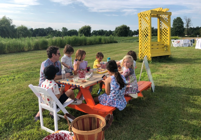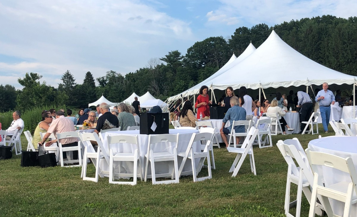 Until COVID-19, The Sylvia Center's Farm Event at Katchkie Farm in Kinderhook, New York, was held under a huge tent, where guests sat together at long tables. Like all organizations,The Sylvia Center has pivoted and its 15th annual fundraiser on June 16 was held, for the third time, picnic style. All of the food was provided by Great Performances, whose owner, Liz Neumark, established Katchkie Farm and The Sylvia Center. The nonprofit organization teaches young people about the connection between food and health through nutrition-focused, culinary-based programming, both in New York City and in Columbia County. In the past year, The Sylvia Center has educated over 2,000 students and distributed over 2,500 fresh food meal kits, which gave students and their families access to fresh and healthier food. Following the auction winner announcements, the guests departed alongside the field of sunflowers at sundown, carrying home jars of Thunder Pickles, made by two members of The Sylvia Center's teen program, who were present to showcase their work.