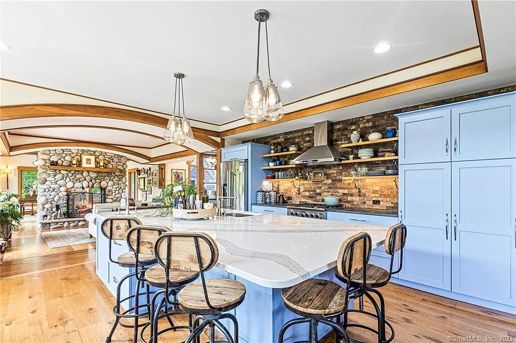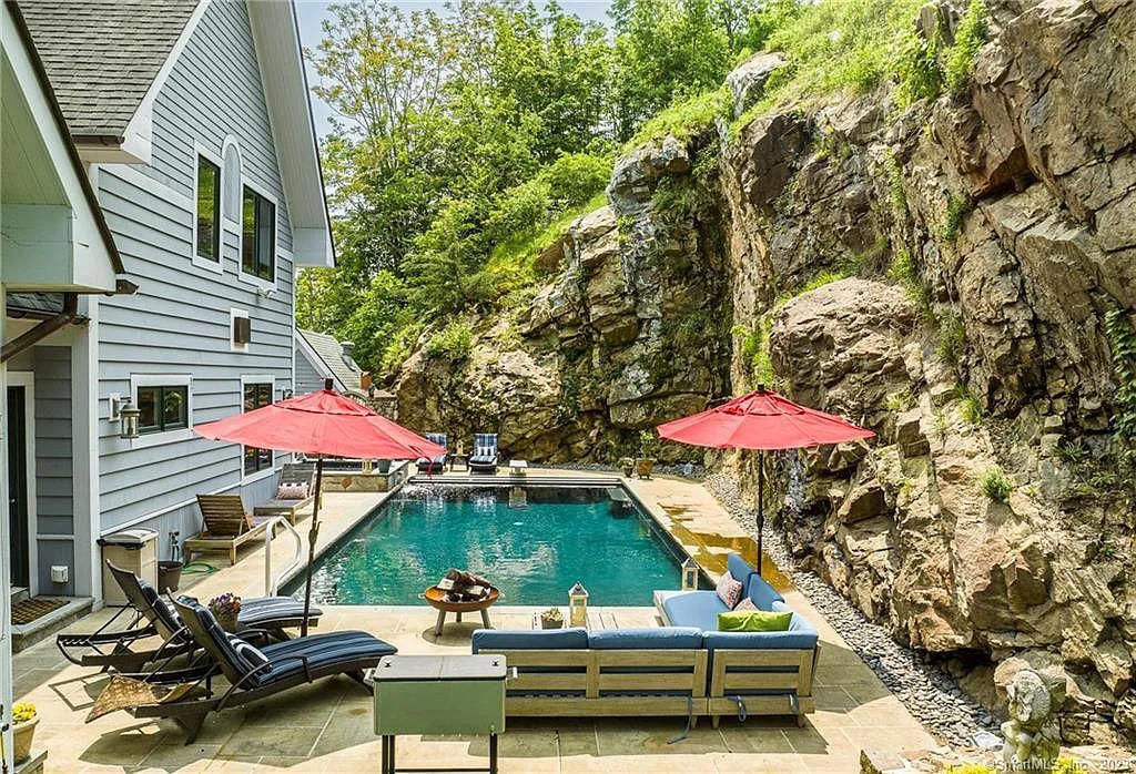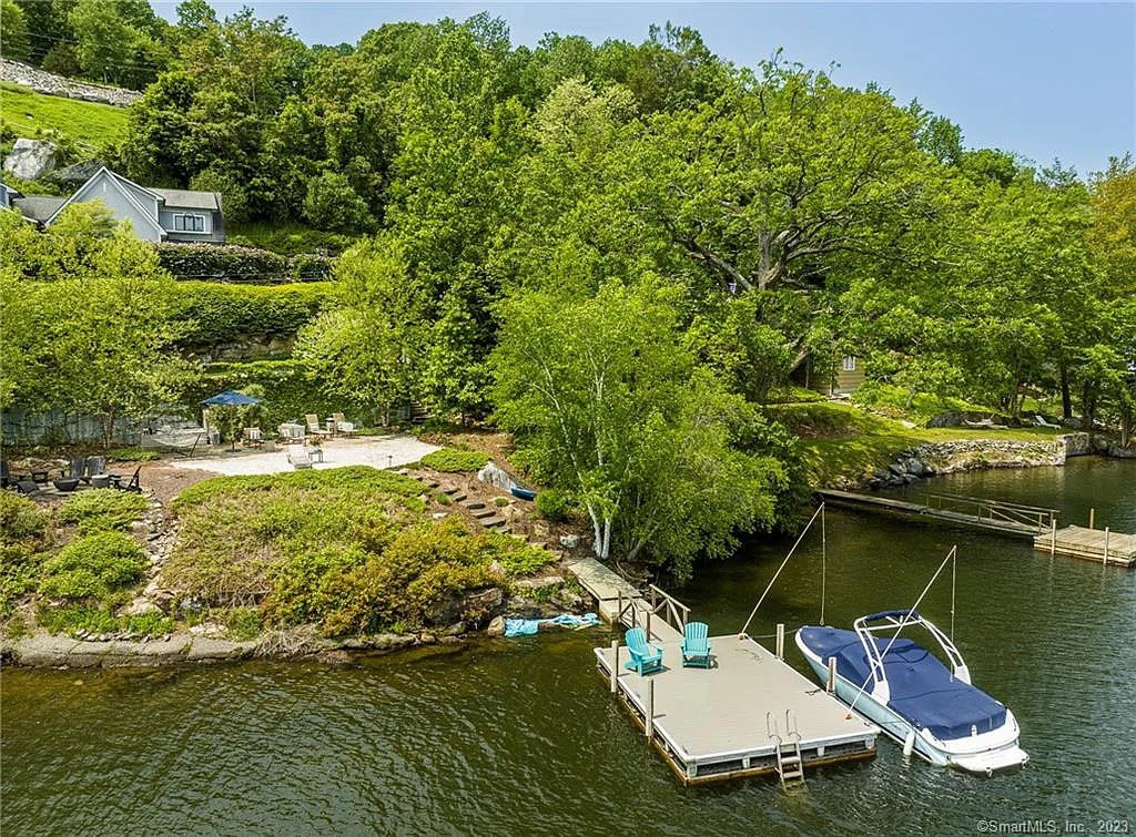 This property in New Milford has it all. Diving pool with waterfall, spa and new Gunite/tiles, outdoor shower and pool bathroom, built-in high-end BBQ, spectacular rock wall and new gardens and beautiful gates. Heated three-plus car/boat garage, four bedrooms and seven bathrooms, with en-suite baths and bunks for the whole family. Over $850k in improvements include lakefront lot with enlarged boat dock, kayak launch, patio, sandy beach, native plantings, lighting and sound, and propane firepit at water’s edge. Listed at $2,290,000 by Klemm Real Estate.