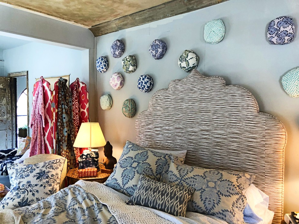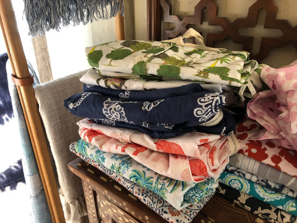 Despite not traveling to India since the arrival of COVID, Robshaw has continued to put out twice yearly collections. He designs the prints in New York, then sends them to Jaipur, where block makers carve the patterns into hardwood and the hand printing ensues. The magnitude of the labor intensity and craftsmanship is hard to fathom, but the evidence of it is piled high on shelves and tables in the warren of rooms in Falls Village. There are nubby, handstitched quilts, throws and sheeting, woven pillows, tabletop items, rugs, curtains, and wallpaper. Robes and pajamas sport playful elephant and palace prints. Elephants, in fact, are a common theme, making appearances in the decorative pillows handpainted by artisans in Jaipur, some of which, Robshaw says, may take days to complete. (A video snippet here shows an artist in action.) A wall sprinkled with turbans pre-tied with Robshaw’s prints form a whimsical constellation above one of the show beds, proving there’s nothing you can’t decorate with a bit of handblocked cloth.
