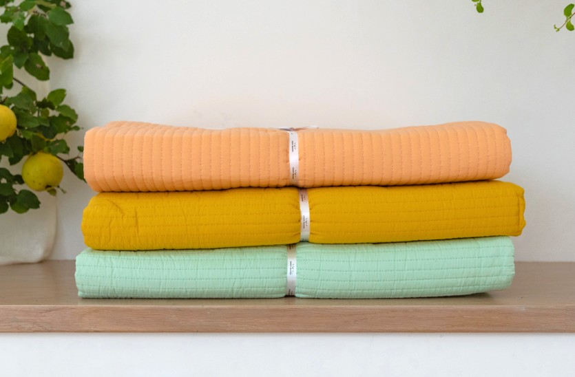 The company’s initial product line includes block-printed sheet separates and crisp whites, quilts and shams, duvet covers and baby bedding. All of the prints and solids have been designed to mix and match in a soft palette of yellow, peach, green and blue. Don’t look for thread count blather here, though. Sister Moons will tell you about its long-staple cotton, the longer, silkier fibers that produce a super soft fabric that’s resistant to pilling and wrinkling, and gets softer and better as you wash it, the women say. The prints are more modern than a traditional Indian pattern, but still exhibit the artisan’s hand. The percale-weave whites are a “super crisp cool sheet, like a high-end hotel sheet,” the sisters say. “If you run hot, or are looking for a summer sheet, we recommend the percale.”