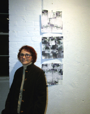 Eclipse Mill Gallery manager Julia Dixon with Woodshed co-founder, artist Danny O; artists Debi Pendell and Zan Klain in front of two of Klain's collages.
