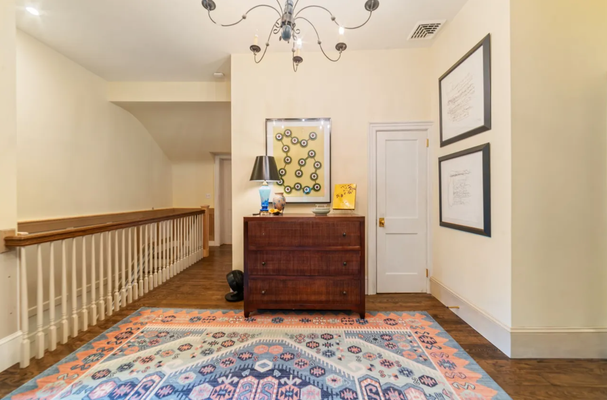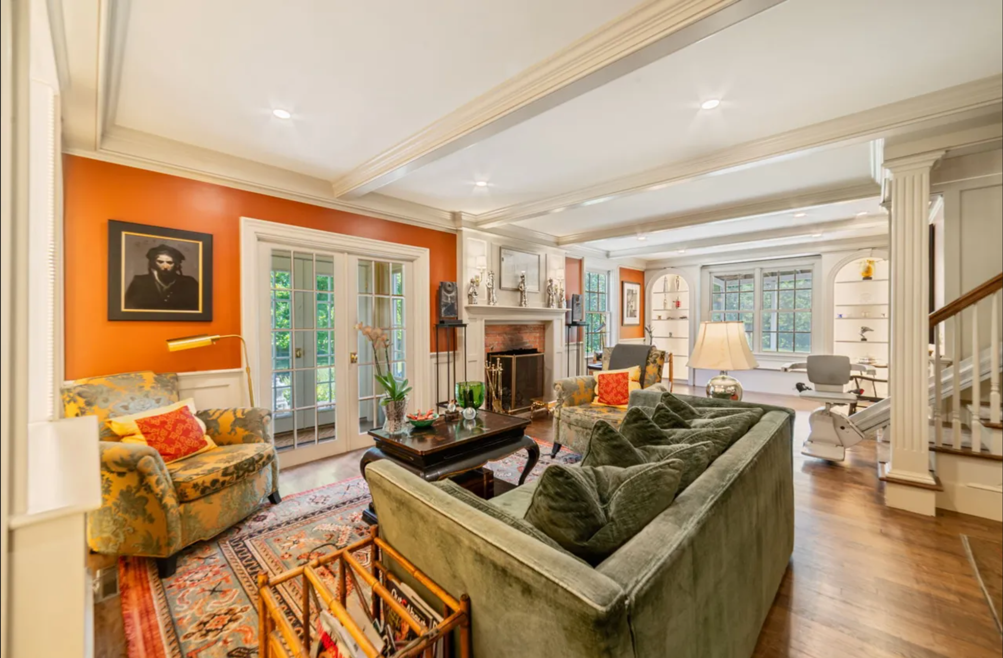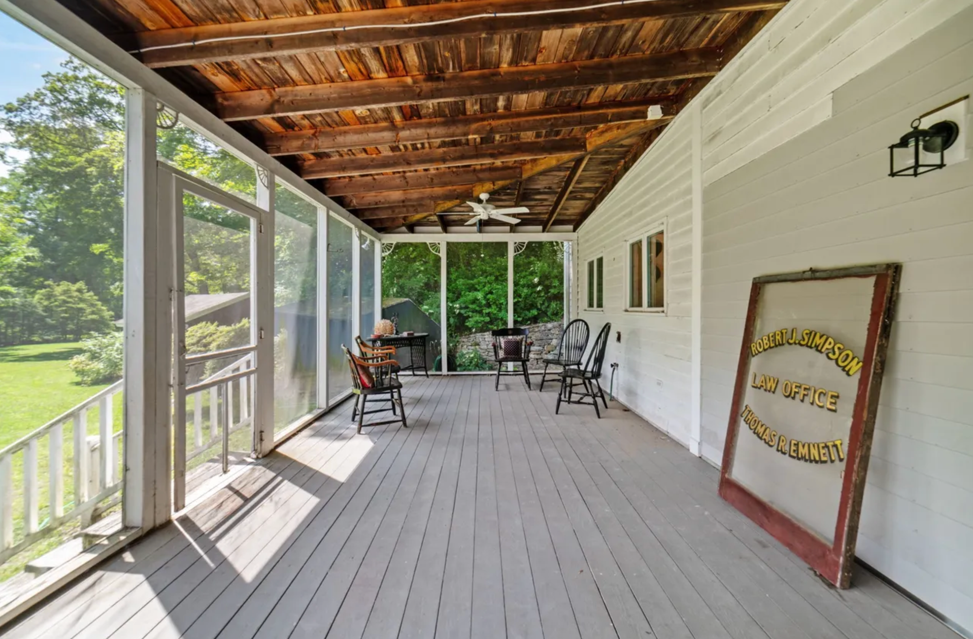 The house offers 2,784 square feet with three bedrooms and three full baths across a traditional layout; rooms built around their purpose, wide floorboards, and a full-length screened porch that opens the whole thing to the sound of the river. Two wood-burning fireplaces, and built-in bookshelves speak to a previous owners who built lives here. The kitchen has been updated with modern appliances and systems, but the provenance remain intact. A two-car attached garage, central air, and a full basement round out the practical picture.