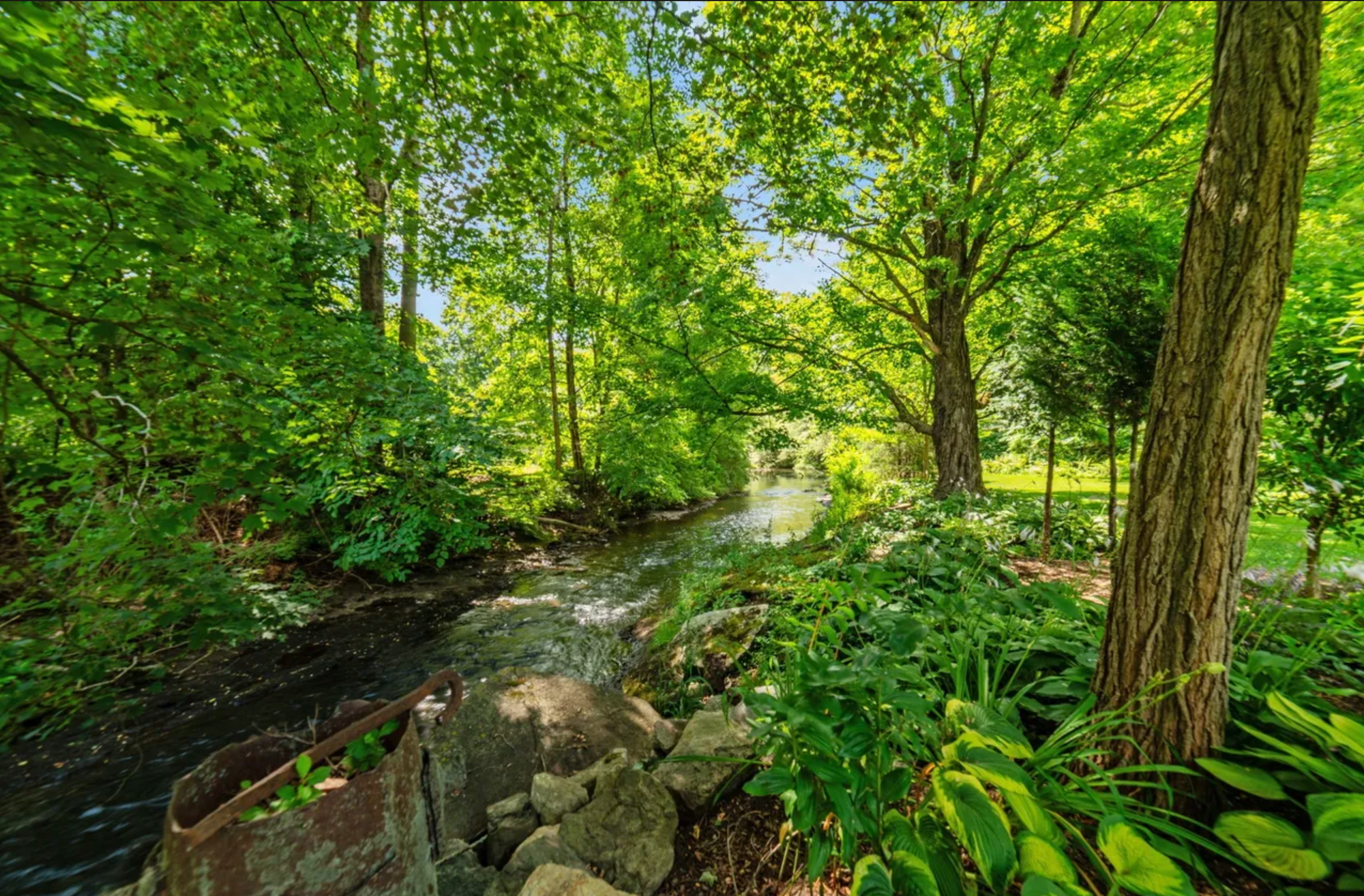 The residence at 28 White Hollow Road in Lakeville, CT is an 1850-vintage farmhouse set along the Salmon Kill River on a just-over-an-acre lot, and it comes with its own private swimming hole.