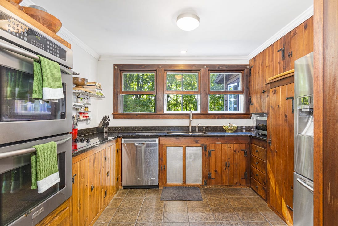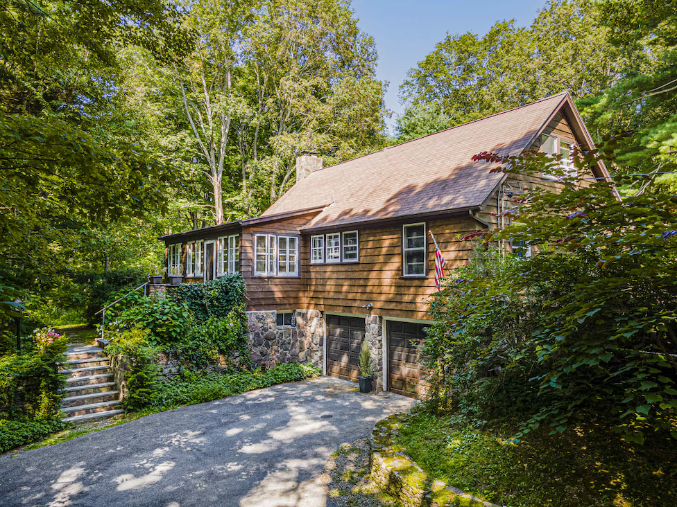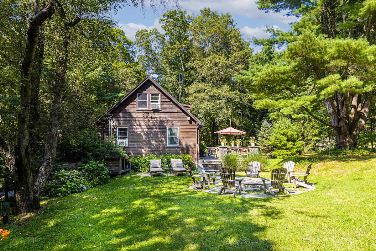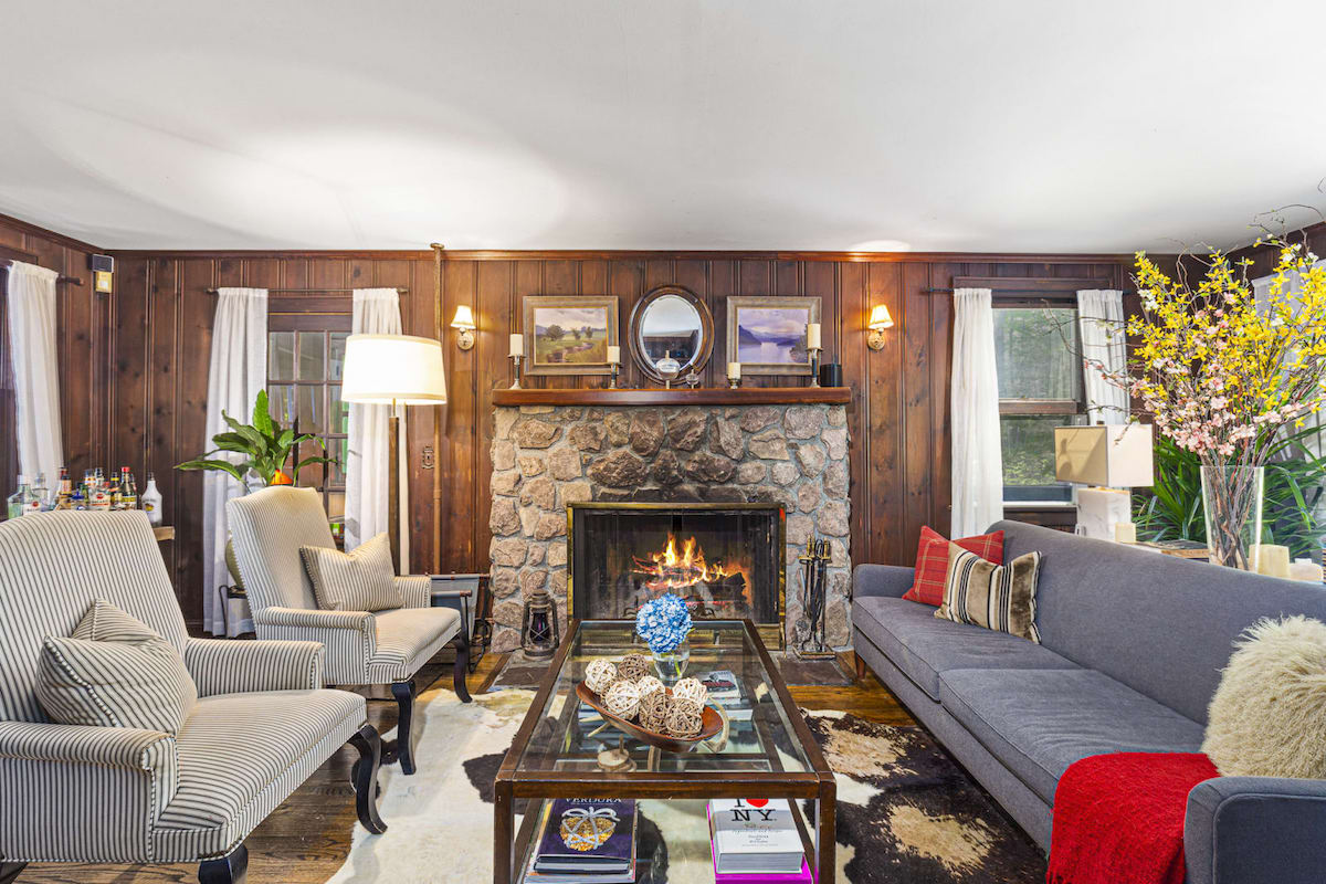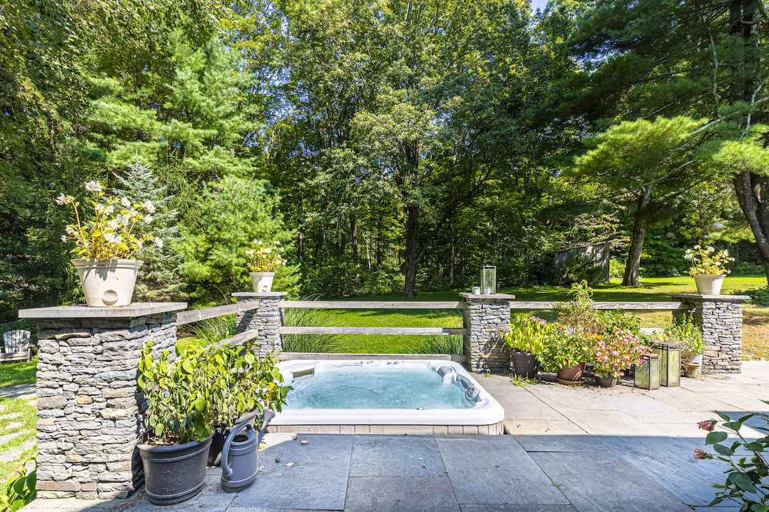 This fieldstone and cedar cottage in Hyde Park has three bedrooms and two bathrooms. The kitchen features the original wood cabinetry. There is an expansive patio with a grill, outdoor dining area and a built-in hot tub. The 2.84-acre setting provides for outdoor entertaining and there is room for a future swimming pool. The nearby Taconic Parkway allows for a 90-minute commute to NYC. Listed at $699,000 by Corcoran Country Living.
