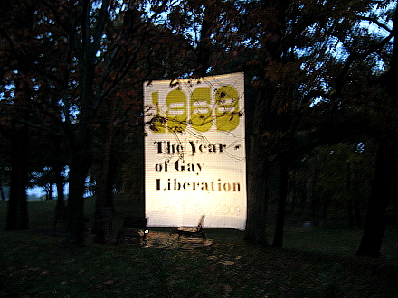 If you can't bring all of Columbia County to the New York Public Library, then bring an NYPL exhibition that is dear to your heart to Columbia County. Thus was the reasoning behind Carey Maloney and Hermes Mallea's Saturday, October 24, showing at their Germantown house of a set of the panels from the library's now-traveling-to-the-branches version of last summer's exhibition. Even the banner that hung outside the main library building on 42nd Street, donated to the NYPL by our Wandering Eye blogger Carey as a wedding gift to Hermes, is now permanently ensconced at their riverfront house, where, at present, it hangs from a mighty oak next to the patio.