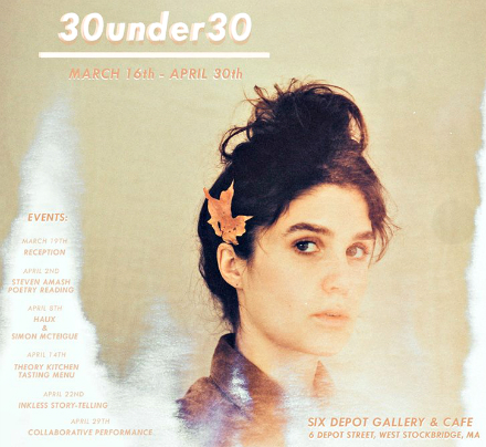 Although Mintz has previously shown her own photographs at Six Depot, this is the first time she’s curated an art show. Despite that, 30under30 is ambitious in scale, showing the work of 23 visual artists as well as unique events throughout the exhibition’s entire run (March 16 – April 30). The opening reception, on Saturday, March 19 from 4-5:30 p.m., will feature live music from Nico Wohl. A poetry reading by Steven Amash will be held on April 2, a musical performance by Haux and Simon McTeigue on April 8, a Theory Kitchen tasting menu by Theo Friedman on April 14, a special edition of INKLESS storytelling on April 22 and a dance performance by Emily Glick, Mika Mintz and Lexie Thrash with digital design by Sam Okerstrom-Lang on April 29. According to Mintz, Six Depot co-owner Lisa Landry’s “ears perked up” (pun not intended) when Mintz broached the idea of 30under30. Landry agrees that “this age group is underrepresented in the area, and the area truly needs to engage young people to encourage them to stay and build lives here, as well as attract other young people.” This bold and intriguing exhibit and event series seems like a great place to start. 30under30 Art Exhibit & Event SeriesMarch 16 – April 30 Opening Reception: March 19 from 4-5:30 p.m.No. Six Depot Café & Roastery 6 Depot St., West Stockbridge, MA