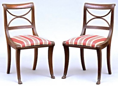 4. Wealth and agriculture on canvas The massive painting "Salting Sheep, Sherman and Lydia Dean Griswold" by James E. Johnson (c.1835-1837) hangs 7.5 by 4 feet. It highlights not just the important stature of its life-size human subjects, but also that of its life-size sheep. Created in “heroic-scale," at the conclusion of an important agrarian period (directly prior to the Industrial Revolution), the painting depicts the act of "salting sheep," which apparently was done on Sundays after church. Griswold owned 10 farms between Austerlitz and Chatham in this period. Depicted in the painting's background is Hatfield Farm in Spencertown. During the 1830s, sheep raising was the principal economic activity for local farmers. Reportedly, there were 172,000 sheep in Columbia County at that time and only 40,746 people. Through this (large) window it’s easy to see the agricultural thread that runs through the history of a county where farming is still the largest industry. A number of other significant portraits and paintings are on display throughout the centennial exhibits. 5. The way we sat The centennial collection also includes beautiful pieces of furniture that make the properties feel appropriately lived in. Highlights of the collection have been newly reexamined for the centennial including this really smart pair of “New York Side Chairs." Mahogany and ash with reproduction silk fabric and crafted between 1810-1820, the chairs are attributed to American cabinetmaker Duncan Phyfe and/or his workshop.