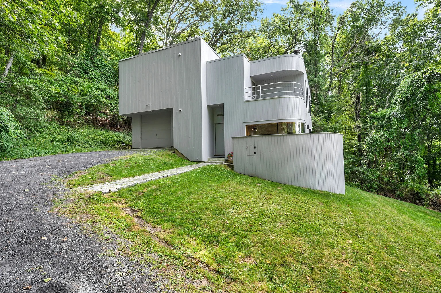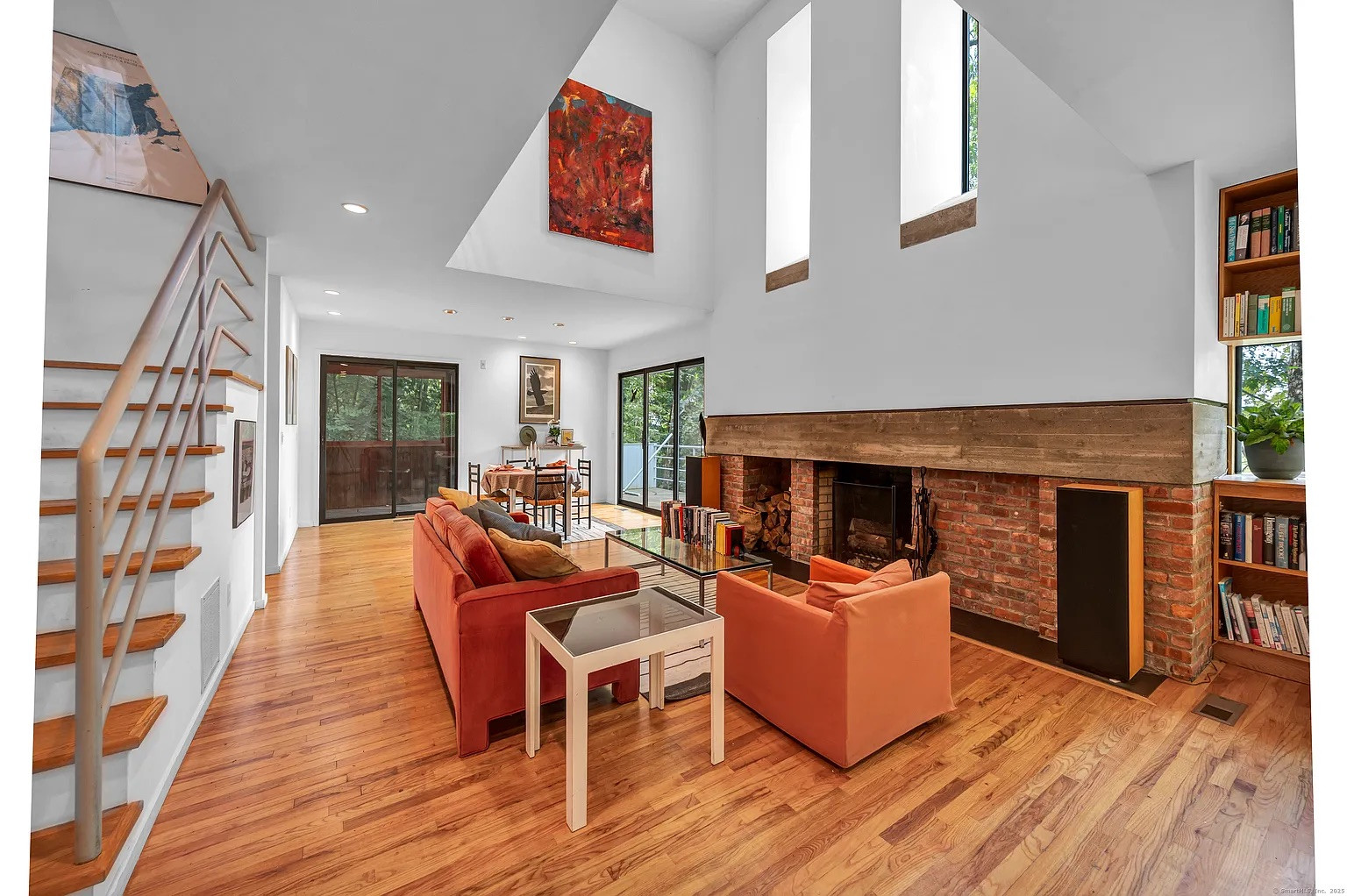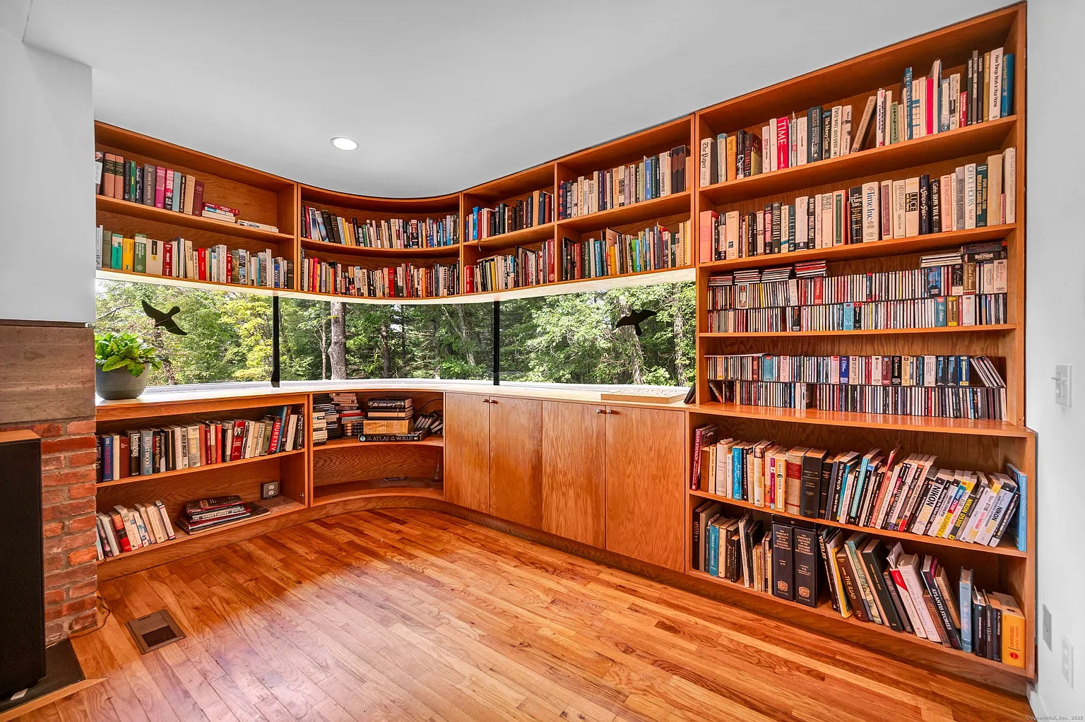 156 Millerton Road in Sharon is a 1987 modern-contemporary build with incredible stylistic details in and out. Curvy on the outside and situated with views of protected land, this 2,092-square-foot home includes three bedrooms and three baths across two levels. Inside, it’s got skylights, a long fireplace in the center of the main living area, custom built-in library shelving with its own curvy corner, and a modern kitchen and wraparound second-floor interior balcony.