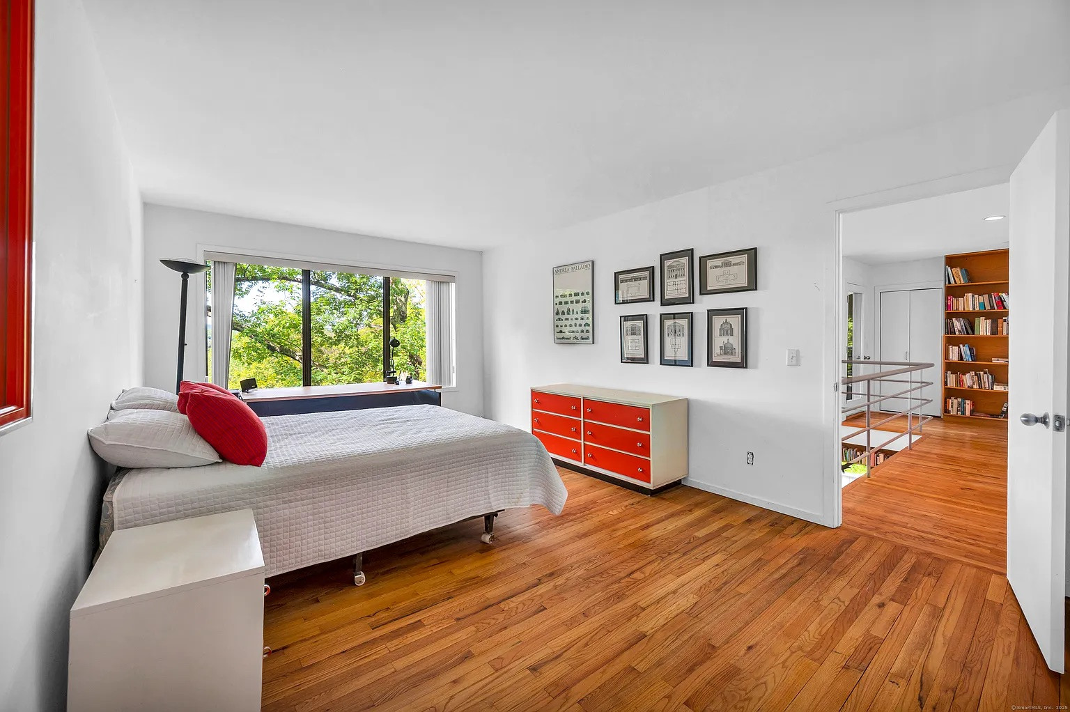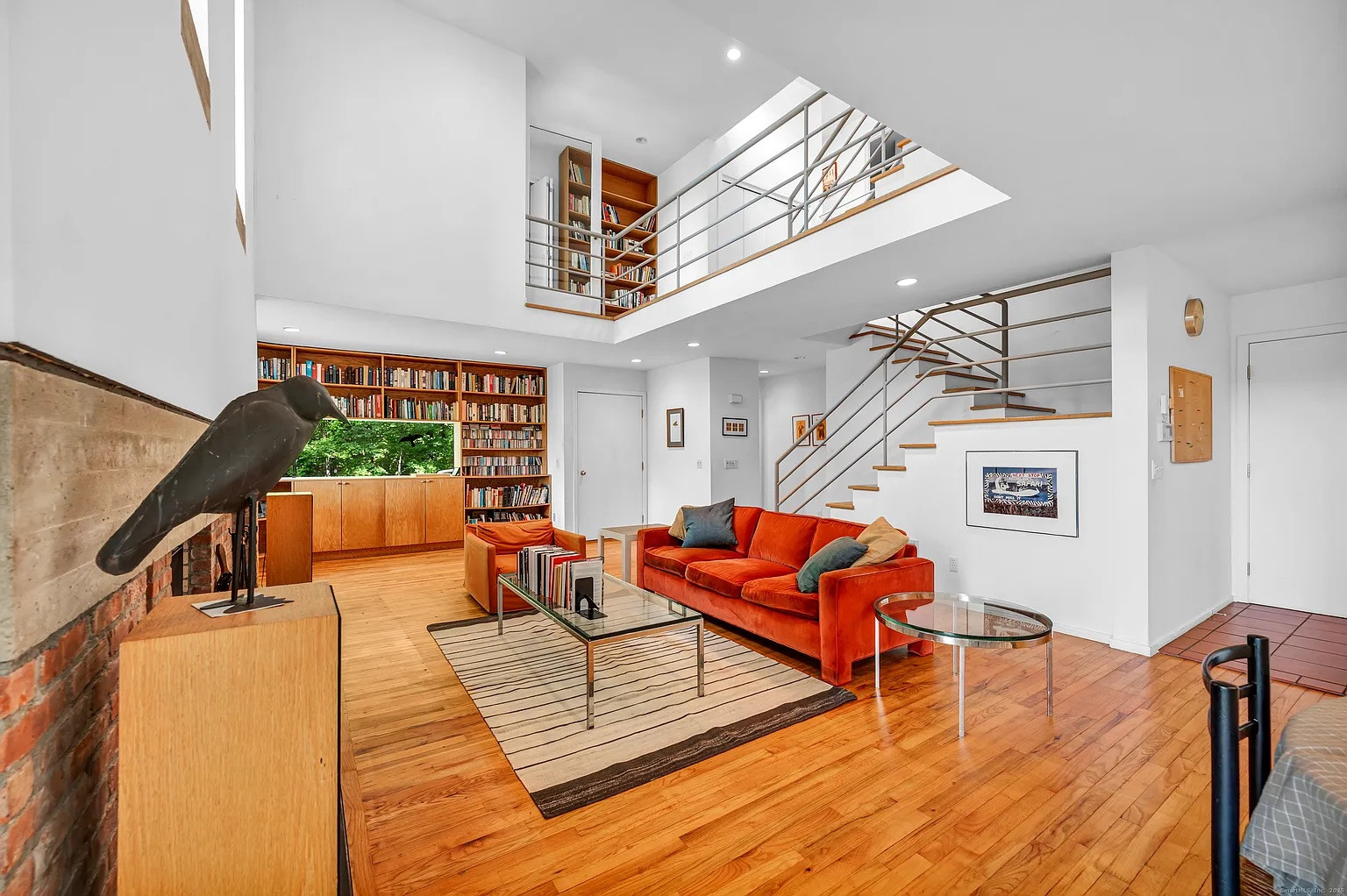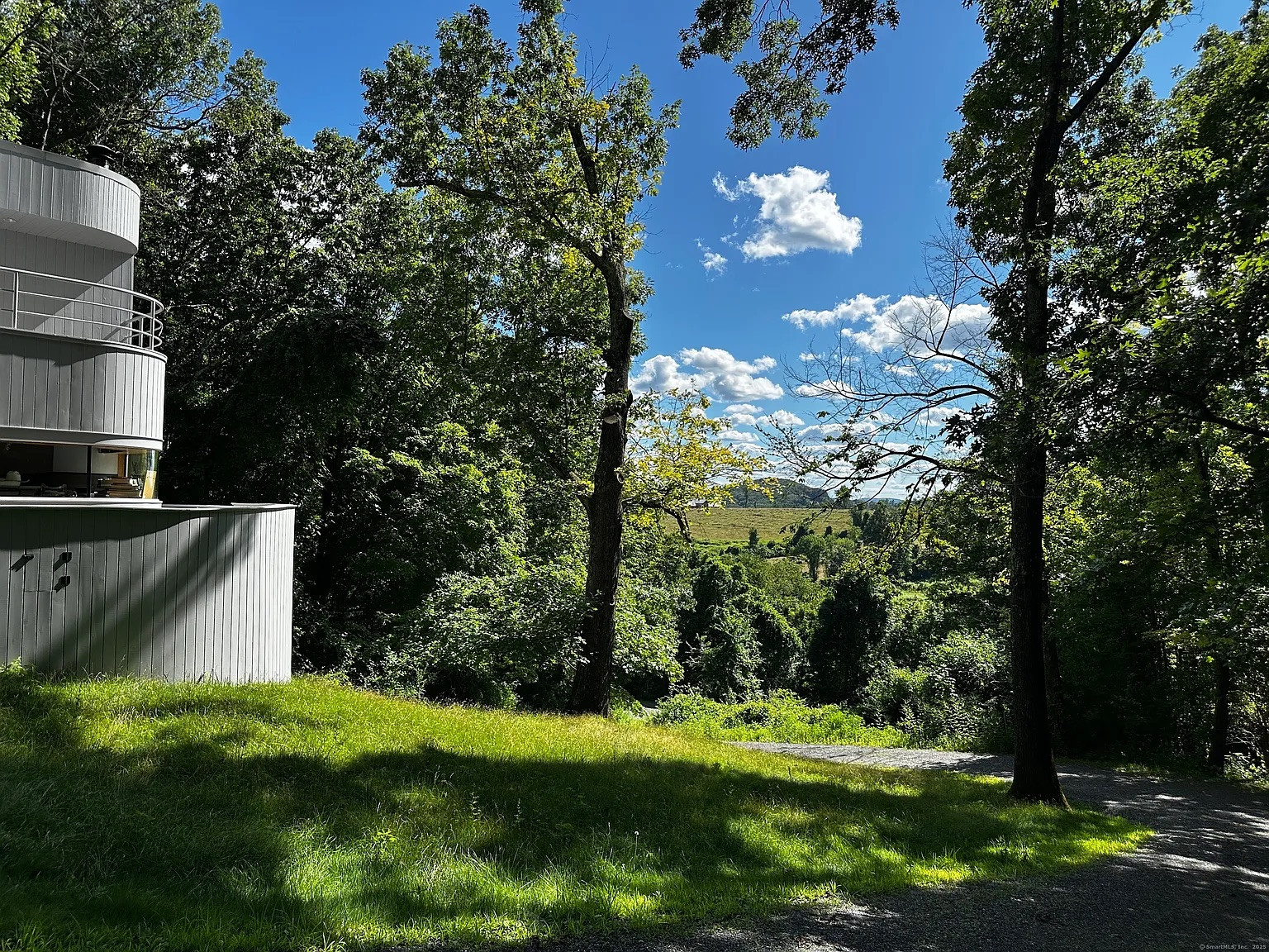 156 Millerton Road in Sharon is a 1987 modern-contemporary build with incredible stylistic details in and out. Curvy on the outside and situated with views of protected land, this 2,092-square-foot home includes three bedrooms and three baths across two levels. Inside, it’s got skylights, a long fireplace in the center of the main living area, custom built-in library shelving with its own curvy corner, and a modern kitchen and wraparound second-floor interior balcony.
