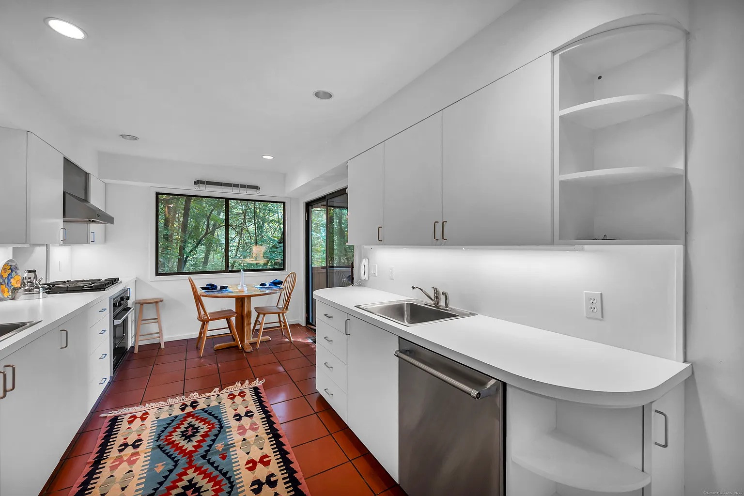 The kitchen is modern and clean with high-end appliances, with great views from large windows. Bathrooms have been updated since 1987, of course, and there’s a second-floor laundry room, plus a balcony and covered deck.