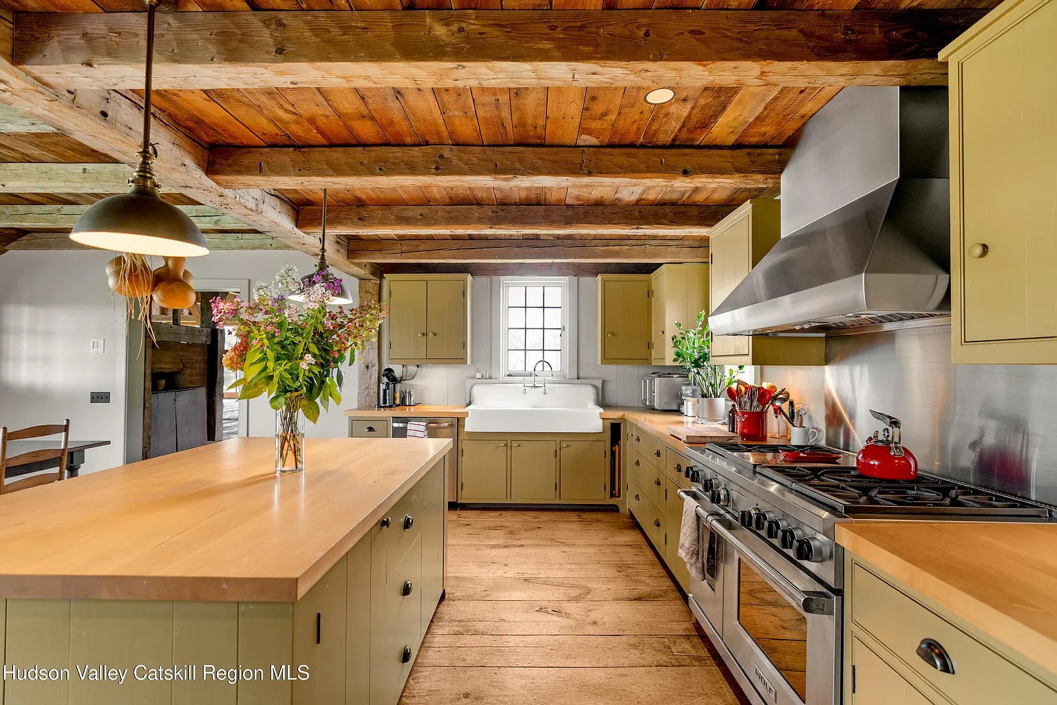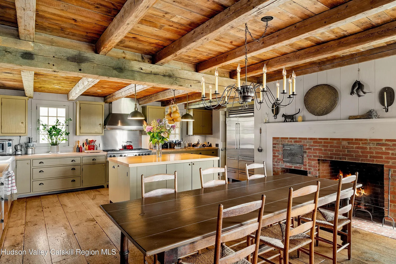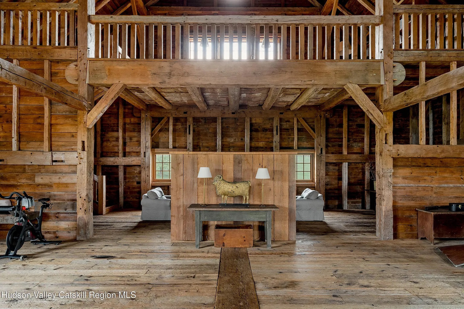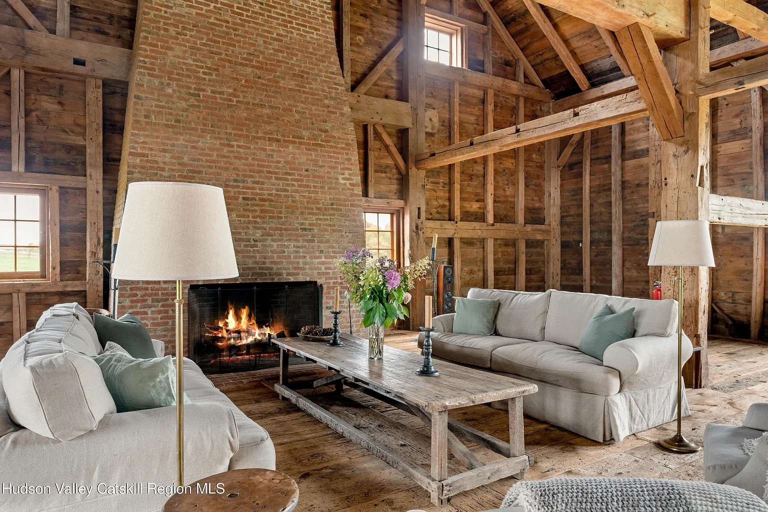 These are the houses that real estate listings are for—we all want to see inside this private 203-acre estate with its own equestrian facilities. The estate at 118 Finkle Road in Ancram was built in 2008, and the original structure is a 1754 Dutch barn which has been dismantled, rebuilt, then stripped down to its beams and turned into a gigantic great room with 34-foot ceilings. There’s a brick fireplace in there, plus giant French doors that walk out to incredible views.