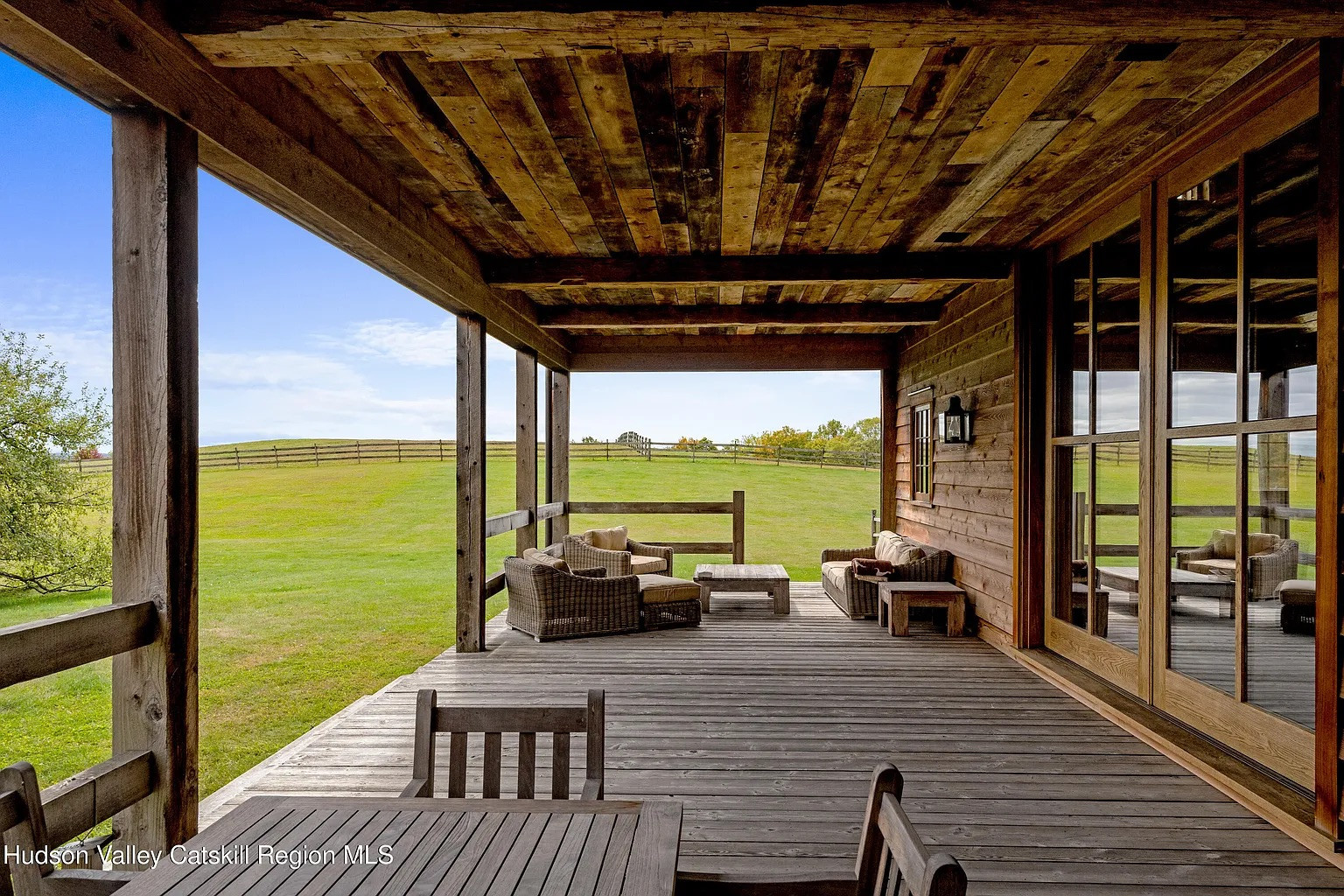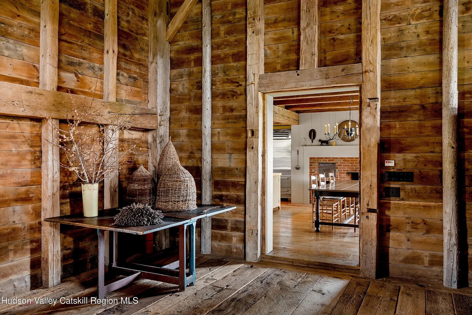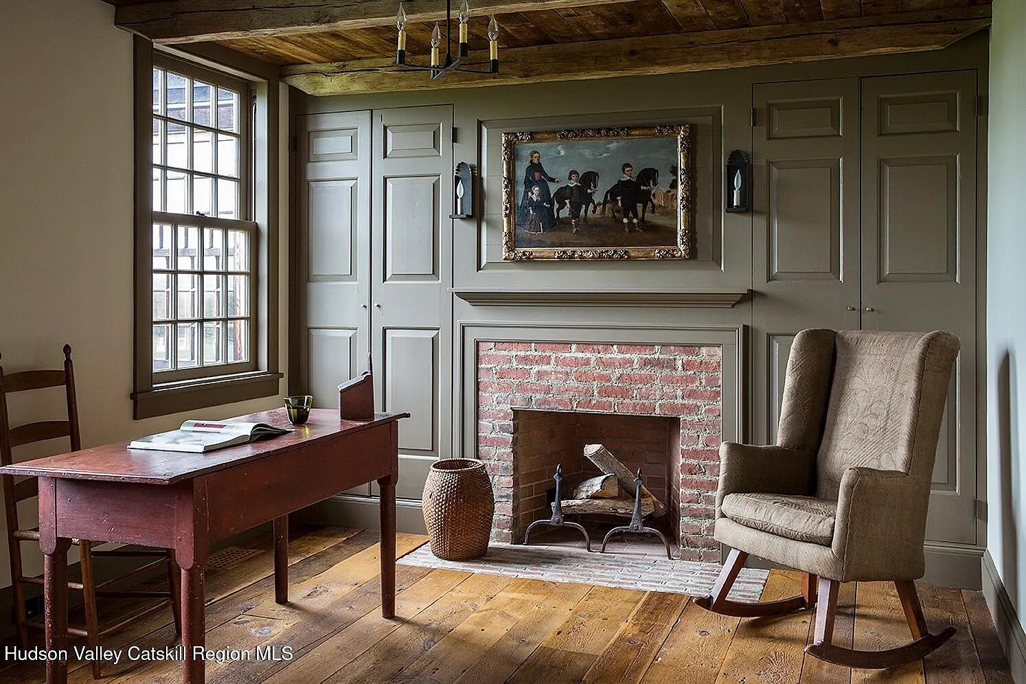 Designed by Cynthia Filkoff, the main house is 6,340 square feet with five bedrooms and three and a half bathrooms. There are wide wood floors and some ancient plaster walls, plus what looks like old wood support beams preserved throughout. There are three fireplaces, plus geothermal heating and cooling. Outside there’s a two-car garage, a three-bedroom “caretaker’s house,” and a huge equestrian facility with a five-stall barn, a barn for equipment, six paddocks, and an outdoor riding ring. Part of the acreage is protected through the Dutcess Land Conservancy.