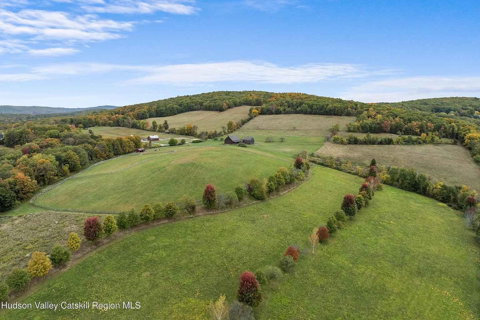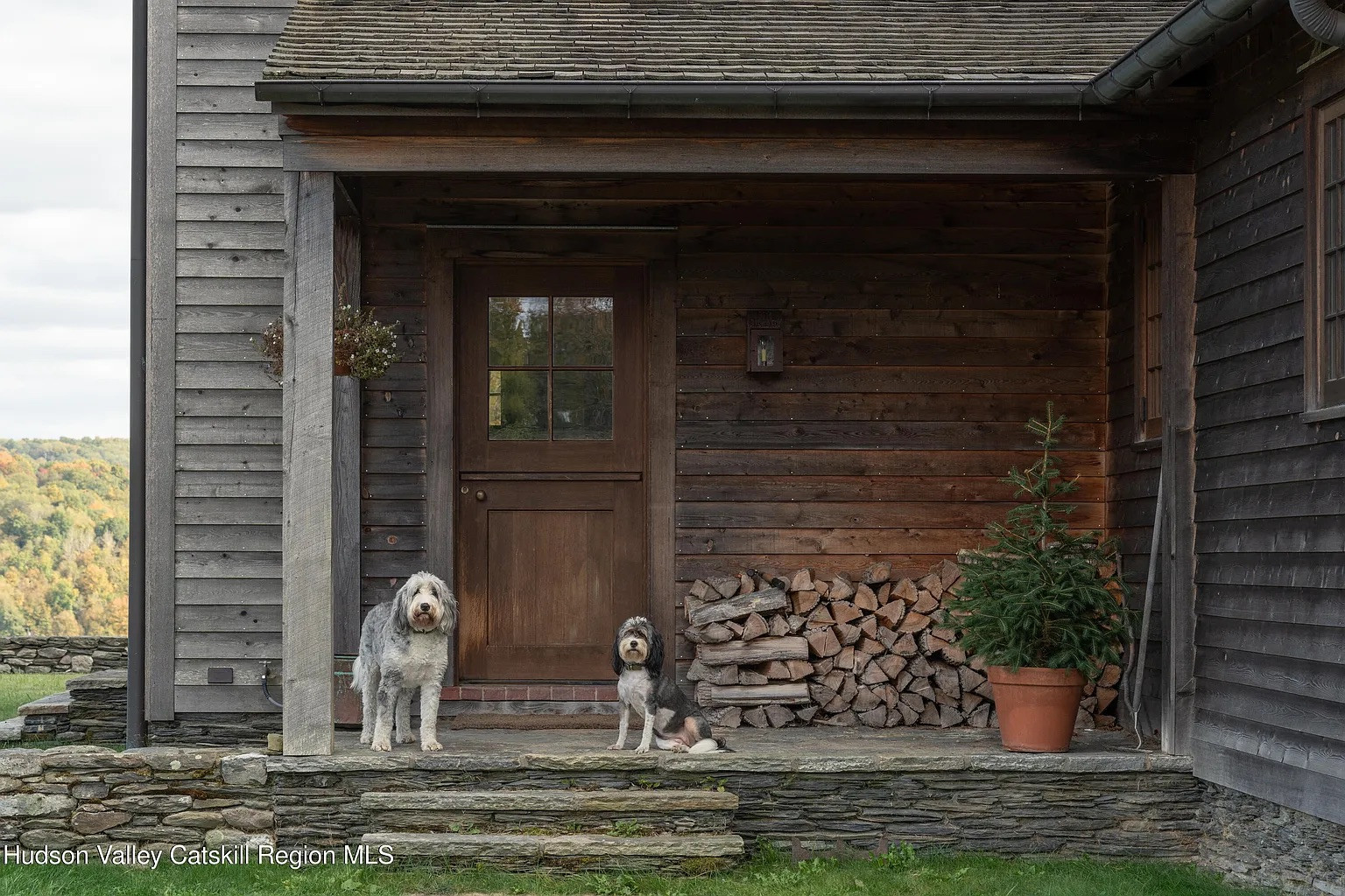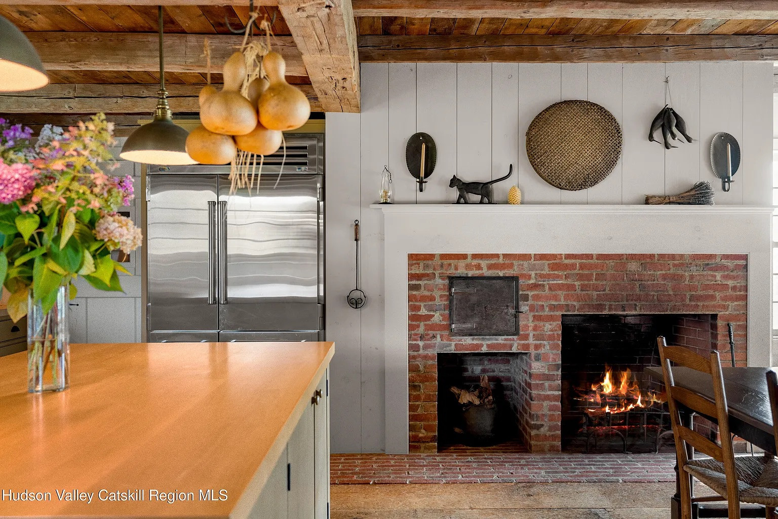 Designed by Cynthia Filkoff, the main house is 6,340 square feet with five bedrooms and three and a half bathrooms. There are wide wood floors and some ancient plaster walls, plus what looks like old wood support beams preserved throughout. There are three fireplaces, plus geothermal heating and cooling. Outside there’s a two-car garage, a three-bedroom “caretaker’s house,” and a huge equestrian facility with a five-stall barn, a barn for equipment, six paddocks, and an outdoor riding ring. Part of the acreage is protected through the Dutcess Land Conservancy.