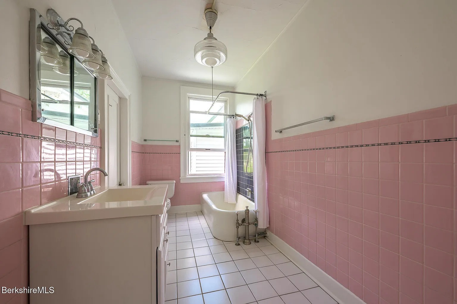 Also on the property are a large barn, a fire pit, and a garage. Inside, there’s hardwood, ceramic tile, a vintage pink bathroom, updated and well-considered light fixtures, and new appliances.
