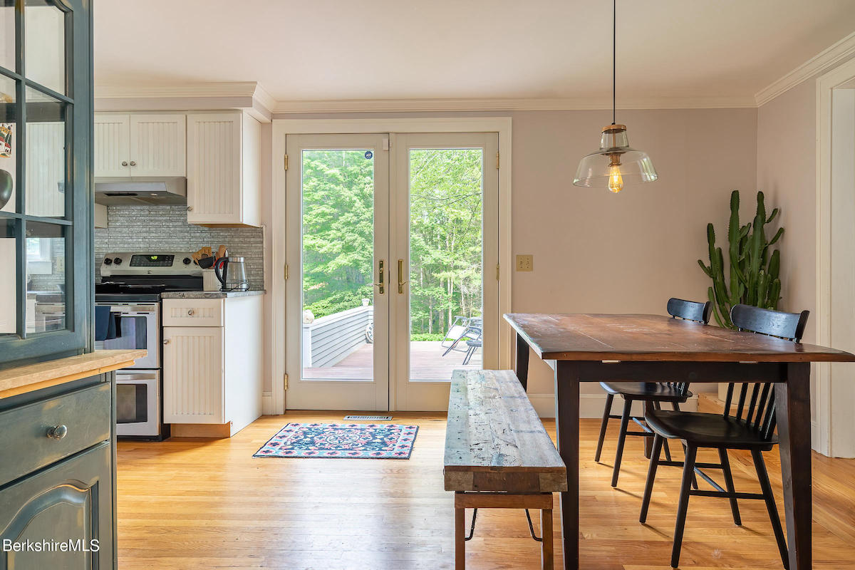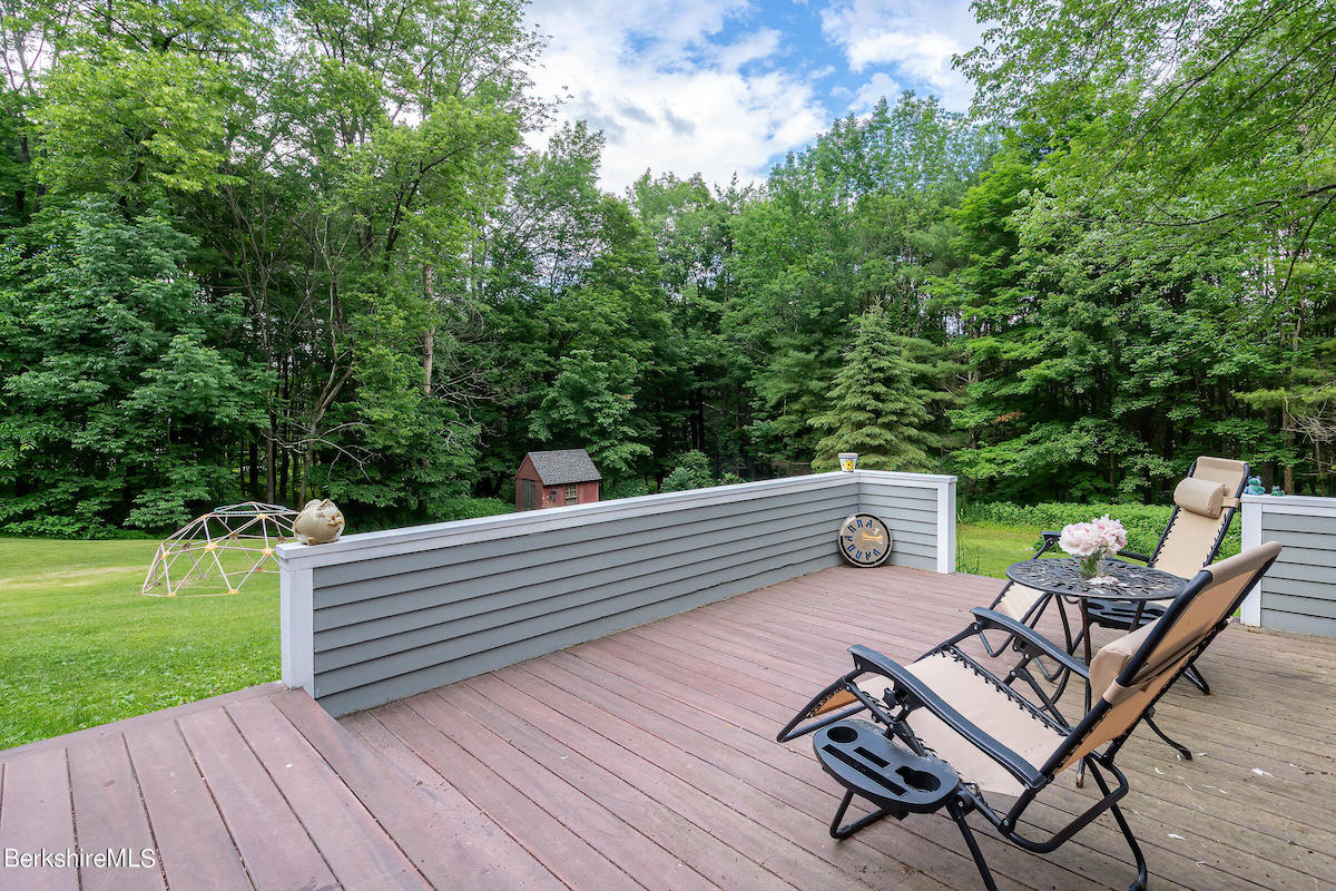 This contemporary New England Cape in Sheffield has three bedrooms and two baths, a cook's kitchen, spacious mudroom, and living room with fireplace and vaulted ceilings. Situated on 1.82 acres, the property offers a large private yard with mature landscaping, a detached two-car garage with available water, electric and its own septic system, and a garden shed. Listed at $495,000 by Alden Country Real Estate Services.