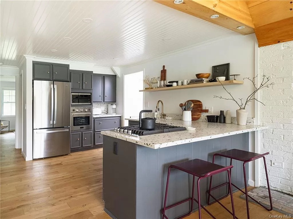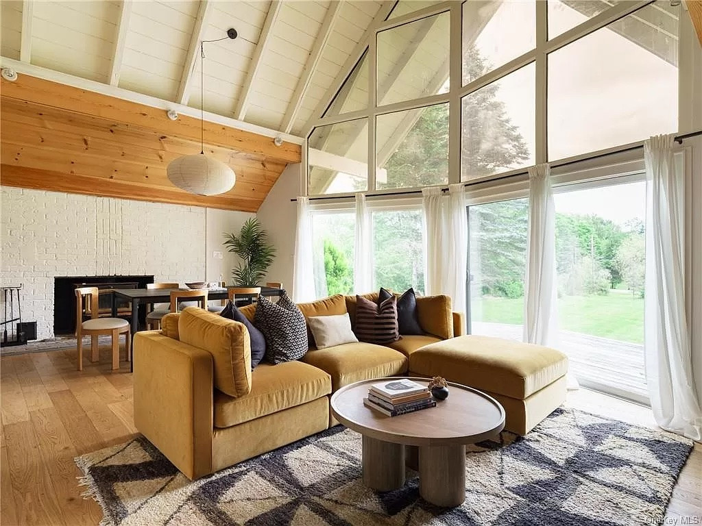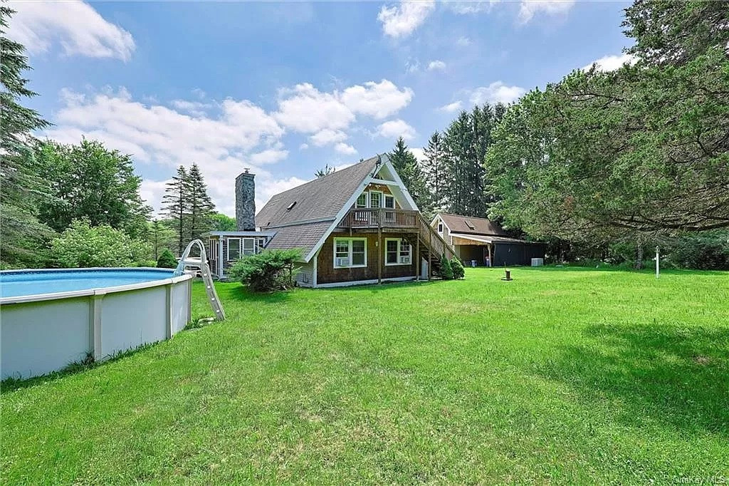 Built in 1977, this A-frame property in Dover Plains has been newly renovated. It has three bedrooms and two bathrooms, two kitchens, and 20-foot ceilings. The upstairs suite has its own dedicated seprate entrance with a kitchenette and office space. In addition, there is a swimming pool and two-car carport. The home is move-in ready with furnishings included in the sale. Listed at $669,000 by Re/Max Town & Country.