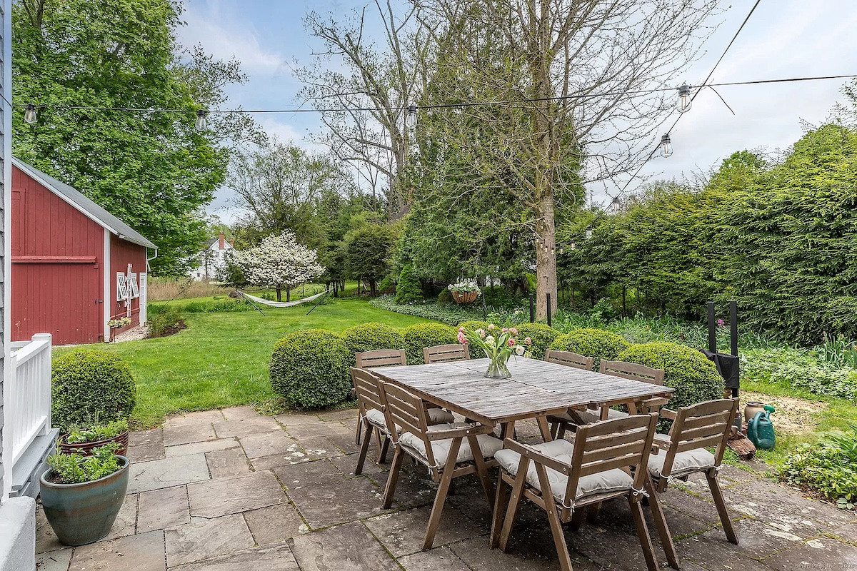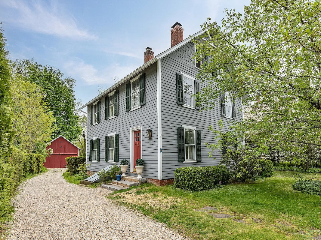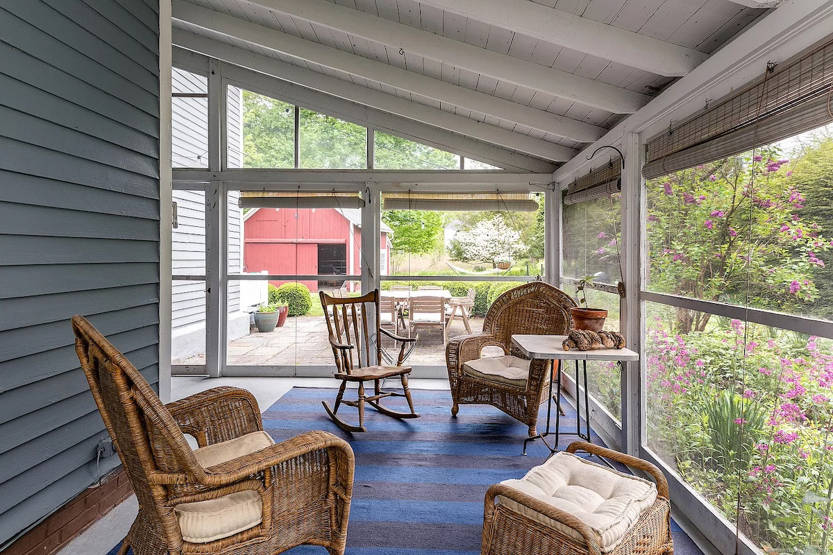 Built in 1800, "Adelaide" welcomes with a blue clapboard exterior with a red door. There are three bedrooms and two bathrooms, a large mudroom with a wood-burning stove and an oversized living room with two seating areas. A spacious screened porch and large stone stone patio offer great hosting areas. The big red barn is the centerpiece. Listed at $595,000 by William Pitt Julia B Fee Sotheby's International Realty.