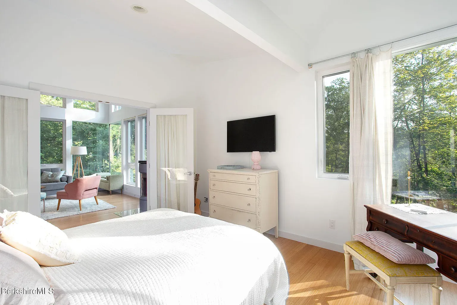 A contemporary house that feels almost suspended in the trees. 324 Park Street in Great Barrington sits on more than 25 acres on the backside of Monument Mountain, where a modern, window filled home is positioned to capture long views through the forest canopy toward the Housatonic River below.