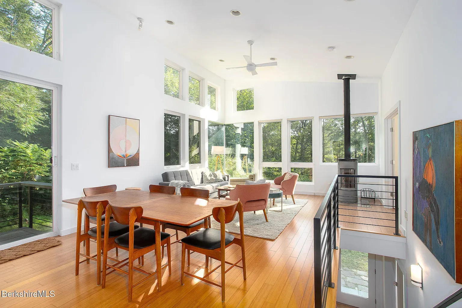 The central living area reads as one continuous space. Kitchen, dining, and lounge spaces are arranged around the view, creating an environment where the outside landscape becomes part of the daily experience. A Scandinavian soapstone wood stove anchors the living room during winter months, while central air and modern mechanical systems keep the house comfortable throughout the year.