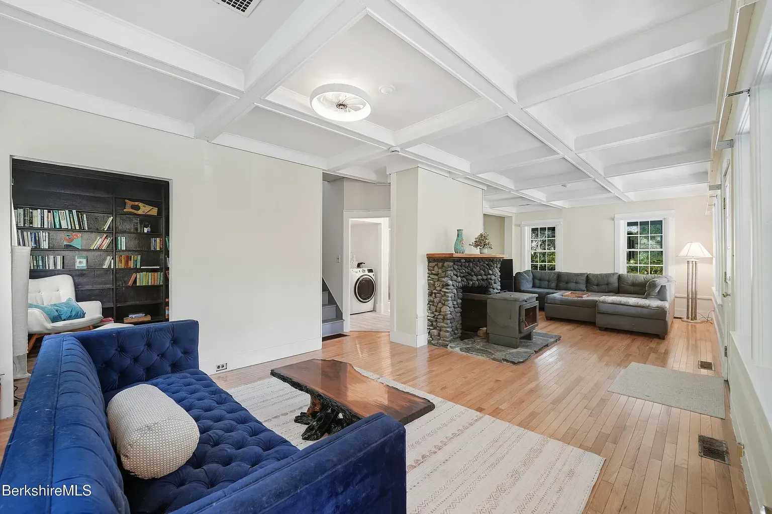 From the road, the home’s traditional lines and historic presence hint at its rich past—it was once home to The Ideal Shoe Company of Danvers—yet the interior unfolds as a generous yet adaptable space where original elements like wide hardwood floors and beautiful exposed beams accentuate every space. Spanning approximately 2,171 square feet, the layout currently includes four bedrooms and two full baths, along with living and gathering spaces that take advantage of natural light through classic windows and a three-season porch.