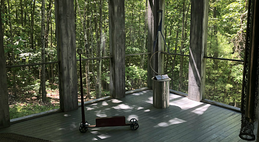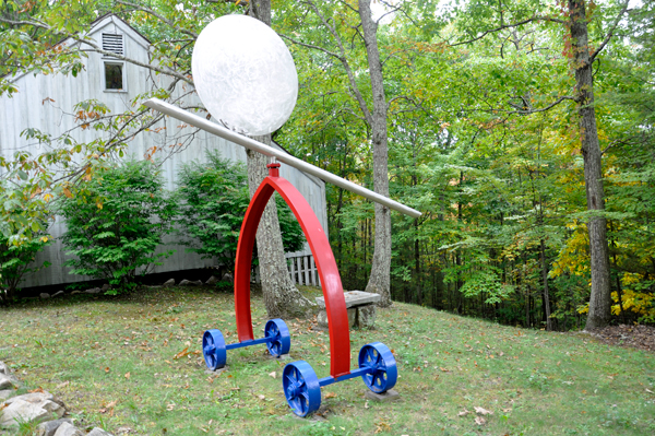 Part of the adventure is just getting there. A turn off Route 7 almost as far south as the Connecticut state line leads to a winding road bisecting farmland, then through a forested glade. An alarmingly steep gravel drive deposits us in the Butler compound. Parking puts us beside the visitor center/gallery, a two-room structure that gives hints of what’s to come, both in artwork and vistas.