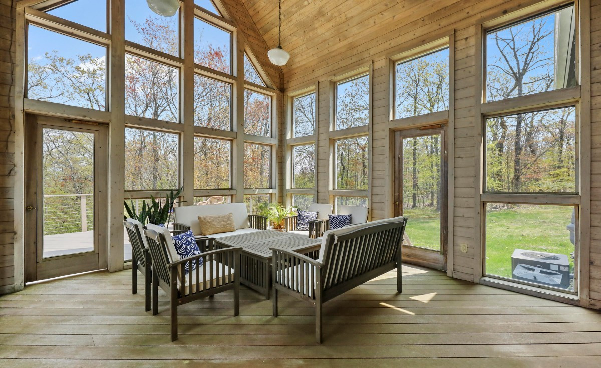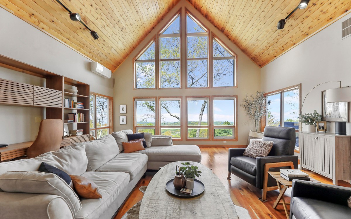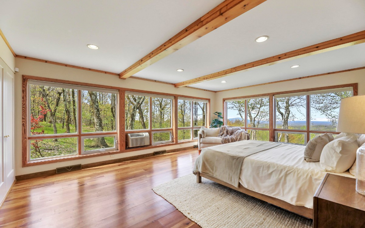 In East Chatham, this Contemporary home on over seven acres has four bedrooms and four bathrooms, an open plan with floor-to-ceiling windows, wood floors, a fieldstone fireplace, a screened porch, and more. The property overlooks the Catskill Mountains, Hudson River and rolling hills. The basement is fully finished and offers a walkout. Listed at $1,249,999 by Berkshire Hathaway Home Services Barnbrook Realty.