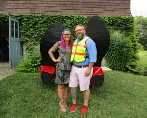 IS183's Carrie Wright and her husband, photographer Bill Wright, who wore a safety vest in homage to the one Nancy wears when she "takes a hike"; the school's ceramics studio manager, Jared Gelormino, with trustee Adrienne Miesmer.