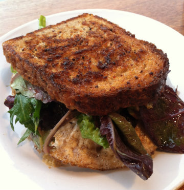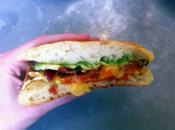 Bonfiglio & Bread Ltd., HudsonThe egg sandwich at Bonfiglio & Bread is simultaneously quintessential and gourmet. To start with, the breads at this Hudson bakery are all unique and delicious, so when I say the quinoa toast this sandwich made its home in was good, it's an understatement. The other ingredient they put their signature on is the bacon, which originates from Raven & Boar farm in Chatham, but subsequently sits in all its pork belly glory in a brine for ten days before it is deemed worthy. The menu says bacon or greens, but I am told that it really is an and/or situation, so I choose and. Cheddar cheese melted against grilled bread, bacon, two fried eggs over easy, mesclun salad that begins its graceful wilt as soon as it joins the party, and this breakfast sandwich is like no other. It's $5 for the sandwich, $1.50 for the greens, $1.50 for bacon... an $8 breakfast sandwich that's worth every penny. --Mary Vaughn WilliamsBonfiglio & Bread Ltd. 748 Warren Street, Hudson, NY (518) 822-0277