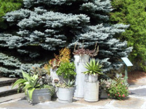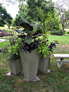 Every year at The Berkshire Botanical Garden in Stockbridge Mass., the curators invite some of the region’s most talented garden and landscape designers to create individual container gardens that are sited throughout the garden. The exhibit is called “Contained Exuberance.” Tucked away in different spots around this 15-acre horticultural gem, visitors come upon these surprise arrangements as they stroll the grounds viewing the permanent beds and display gardens, which are open to the public from May to mid-October. I was flattered to be asked to design a group of pots this year for the second time. A few years ago, I created an arrangement of succulents of all varieties planted in my own collection of repurposed galvanized tubs, barrels and buckets. I was assigned a spot in full sun on a stone terrace, so I wanted to choose something heat tolerant and tough, but unusual. There are countless varieties of succulents, from the huge-leaved Kalanchoe gastonis-bonnieri (Donkey ears) to the tiniest baby fingernail-sized chartreuse Sedum ‘Ogon.’ I absolutely adore succulents! Many look like they were either designed by Dr. Seuss or landed on earth from another planet. This year I chose a spot in the shade and decided to use three graduated vertical containers created by concrete designer Justin Madsen of Marveled Designs, which matched the beautiful bench that he would be displaying at BBG this summer in their “Benched” exhibit. For plant selection, first I chose a color palette, in this case, purples and greens. I specifically focused on foliage plants rather than flowers to minimize maintenance, with no need for deadheading. Removal of yellowing leaves is about all that's called for and just a few times during the growing season; the more aggressive growers can be trimmed and shaped to keep in balance with the various plants in relation to each other.