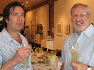 Frances Palmer was already a distinguished art potter—her exquisite flower-filled, hand-thrown pieces dotted the center of the long banquet table—when she asked century-old Buffalo Pottery, makers of diner dishes, to produce from her handmade clay molds a line of high quality dinnerware. Her interactions with the workers at the factory have been life-enhancing for her, she says, and the workers seem to enjoy making something so refined. There was nothing corporate about the "dine" portion of the evening, catered by Mezze of Williamstown. Everyone raved about how beautiful the food looked on Frances Palmer plates and how un-mass-produced Mezze's locavore cuisine tasted.