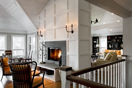 room: we added some very simple paneling, an applied grid, to the fireplace wall, and put in some built-in shelving. But the biggest difference was even less expensive: we painted the wood ceiling white. We also upgraded the fire surround with slate and changed the lighting. And that's it: we made no architectural changes at all, yet it looks completely different. RI: No wonder the Blog Cabin producer chose you. Can you show us some other houses you've transformed?