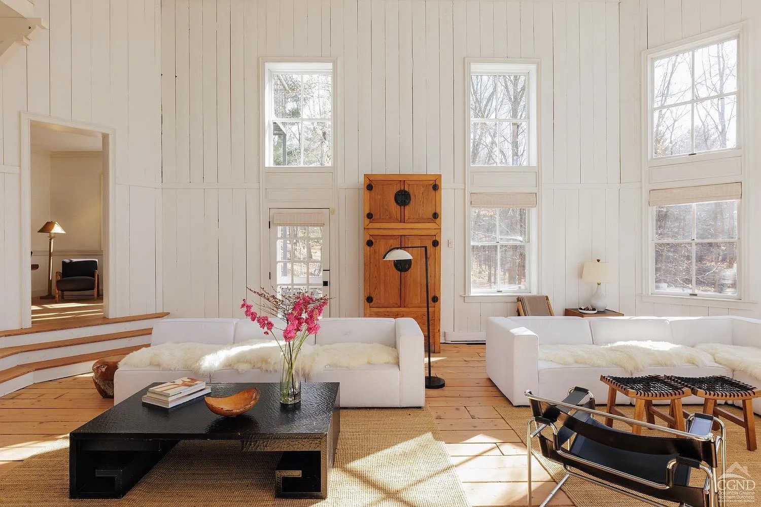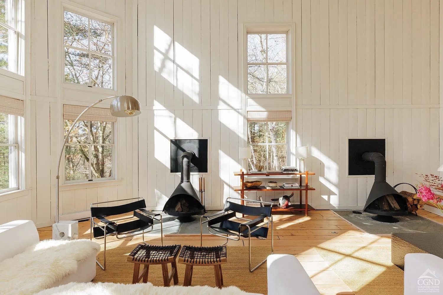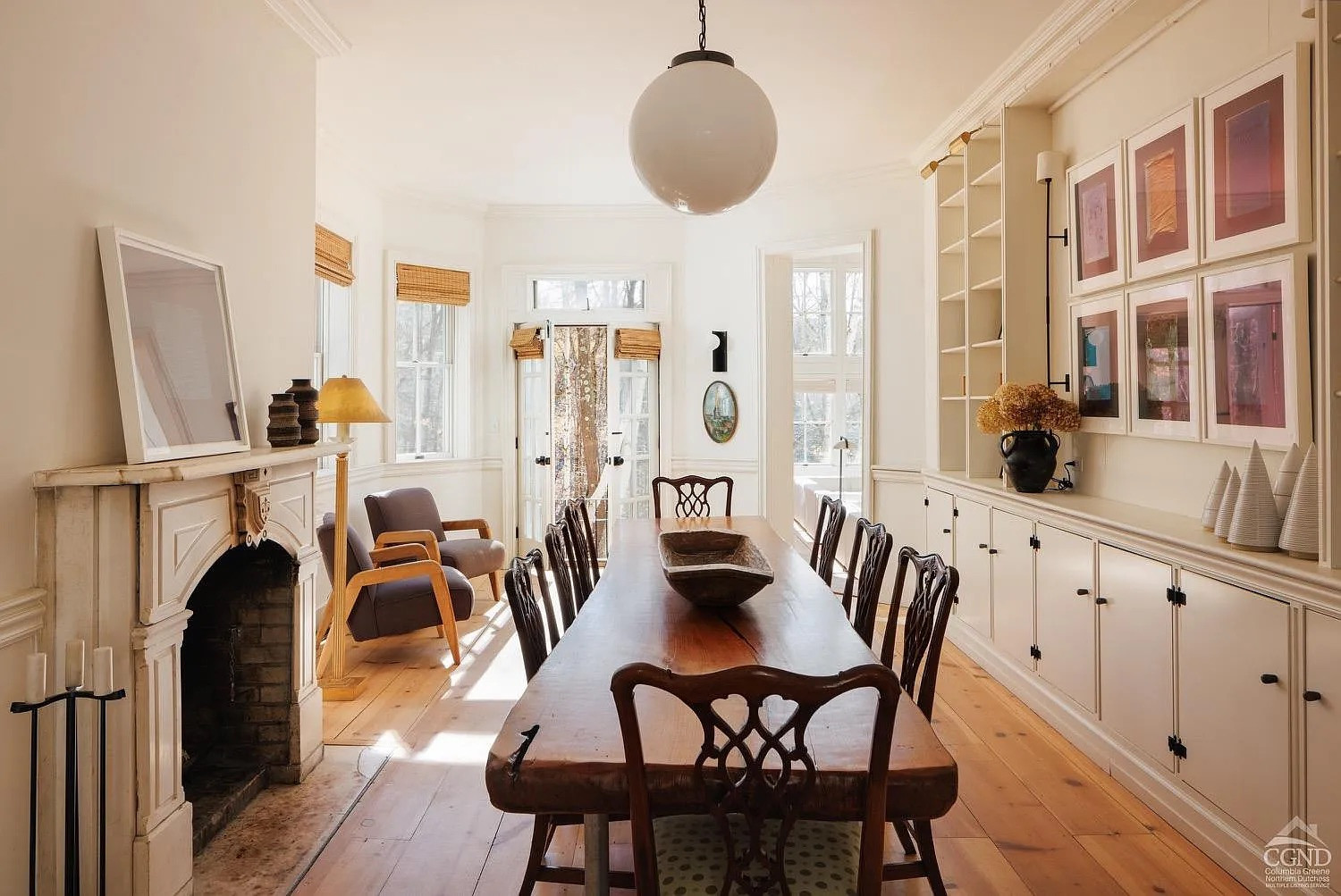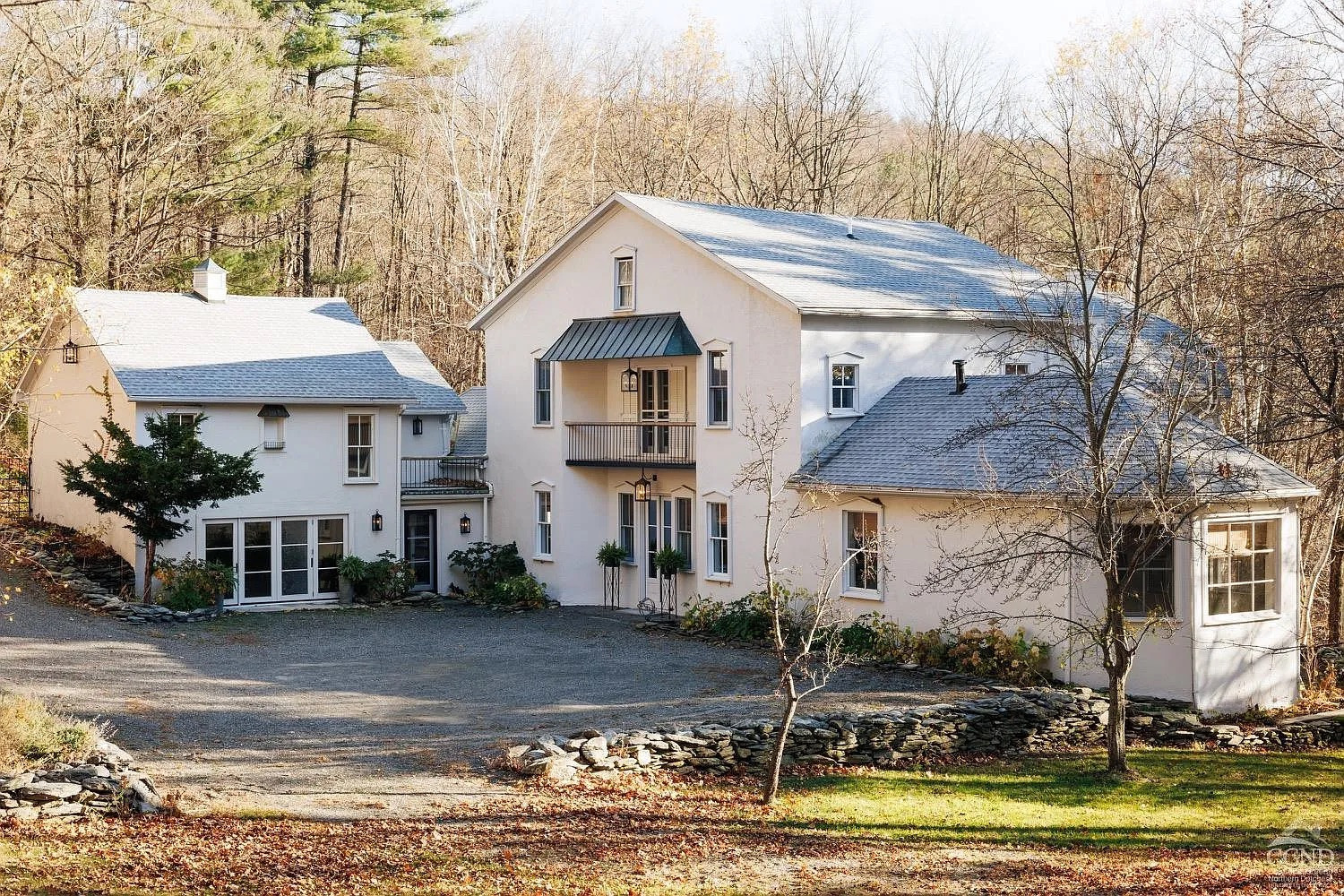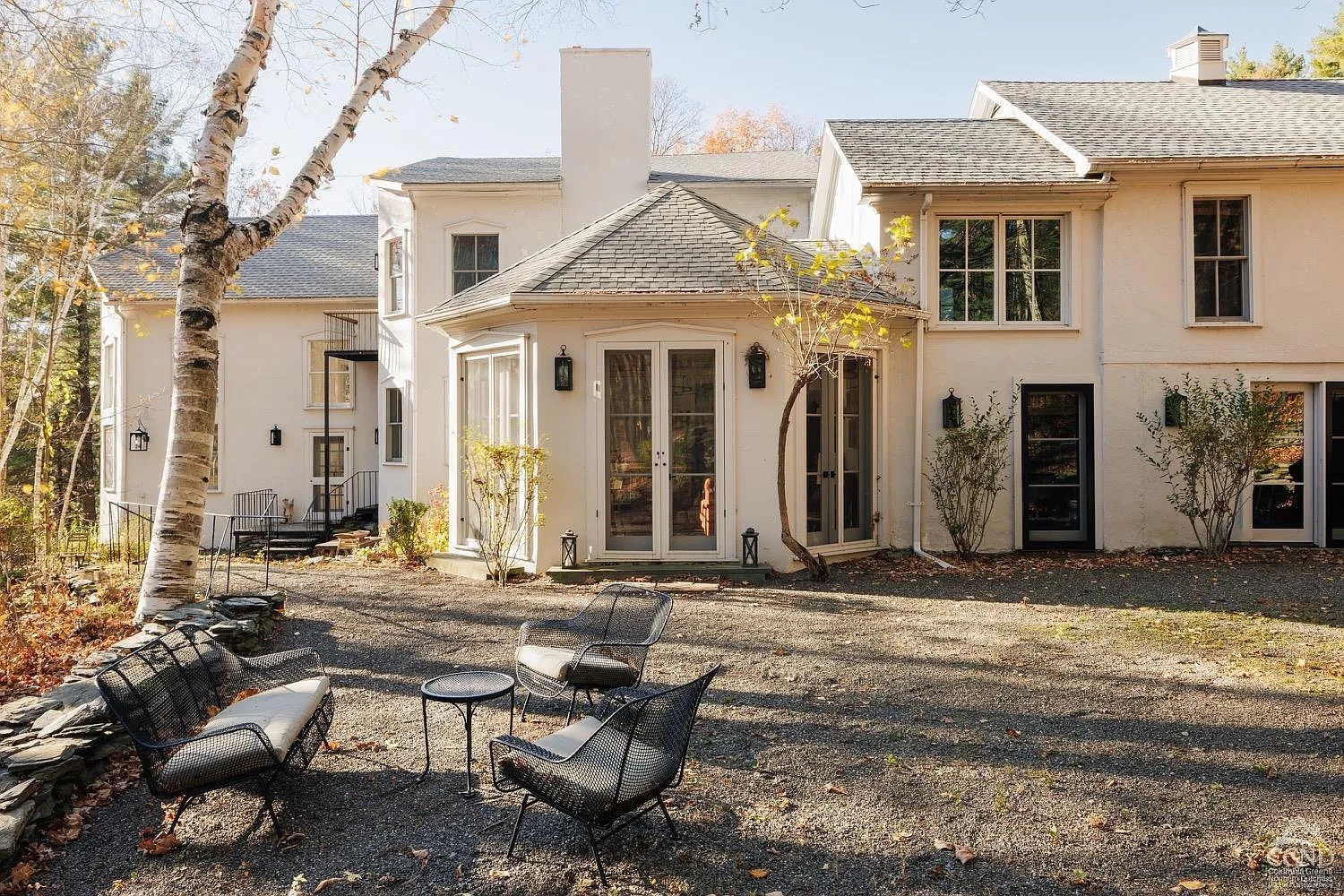 Of course, there's a great room, and of course, there are two wood-burning fireplaces framing the space. Light comes in from a wall of glass that takes advantage of the landscape, and French doors open out to the terraced patio and woodland/pondside views. There are five bedrooms and six bathrooms, a chef's kitchen with a 48-inch oven range, a dining room and parlor, and an interesting wrought-iron staircase (plus matching wrought iron window bars) that leads to the primary suite. That suite has a sitting room, fireplace, spa-like bath, and a private balcony with sweeping views. This estate is about 20 minutes from Hudson and the Berkshires, so it's easy to get to cultural attractions and great food.