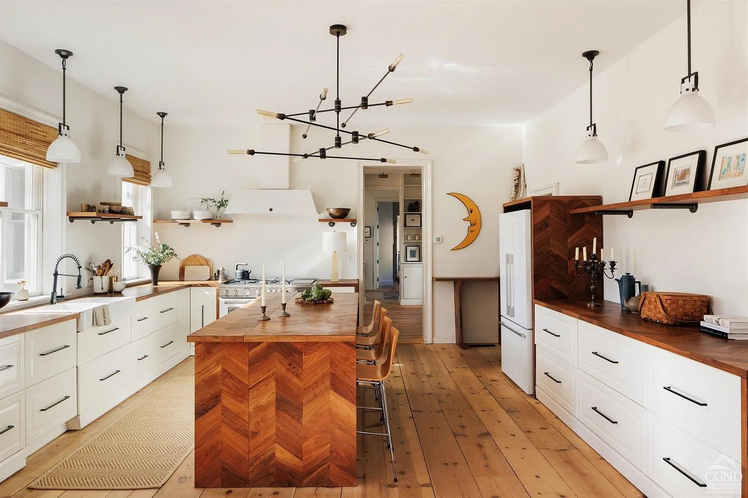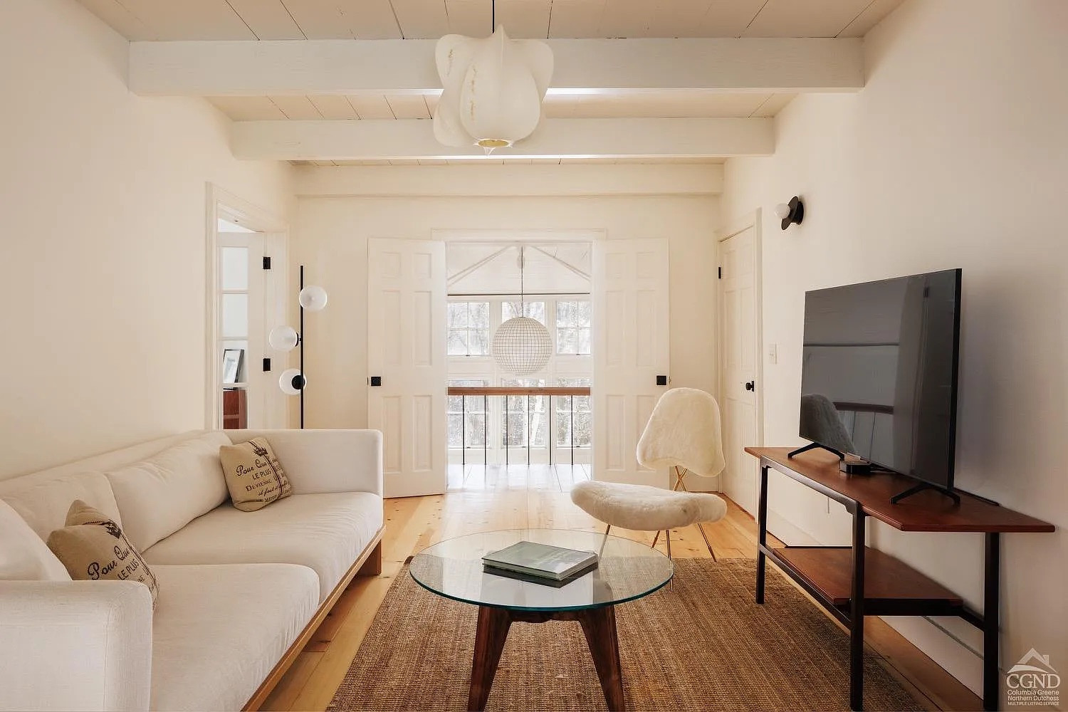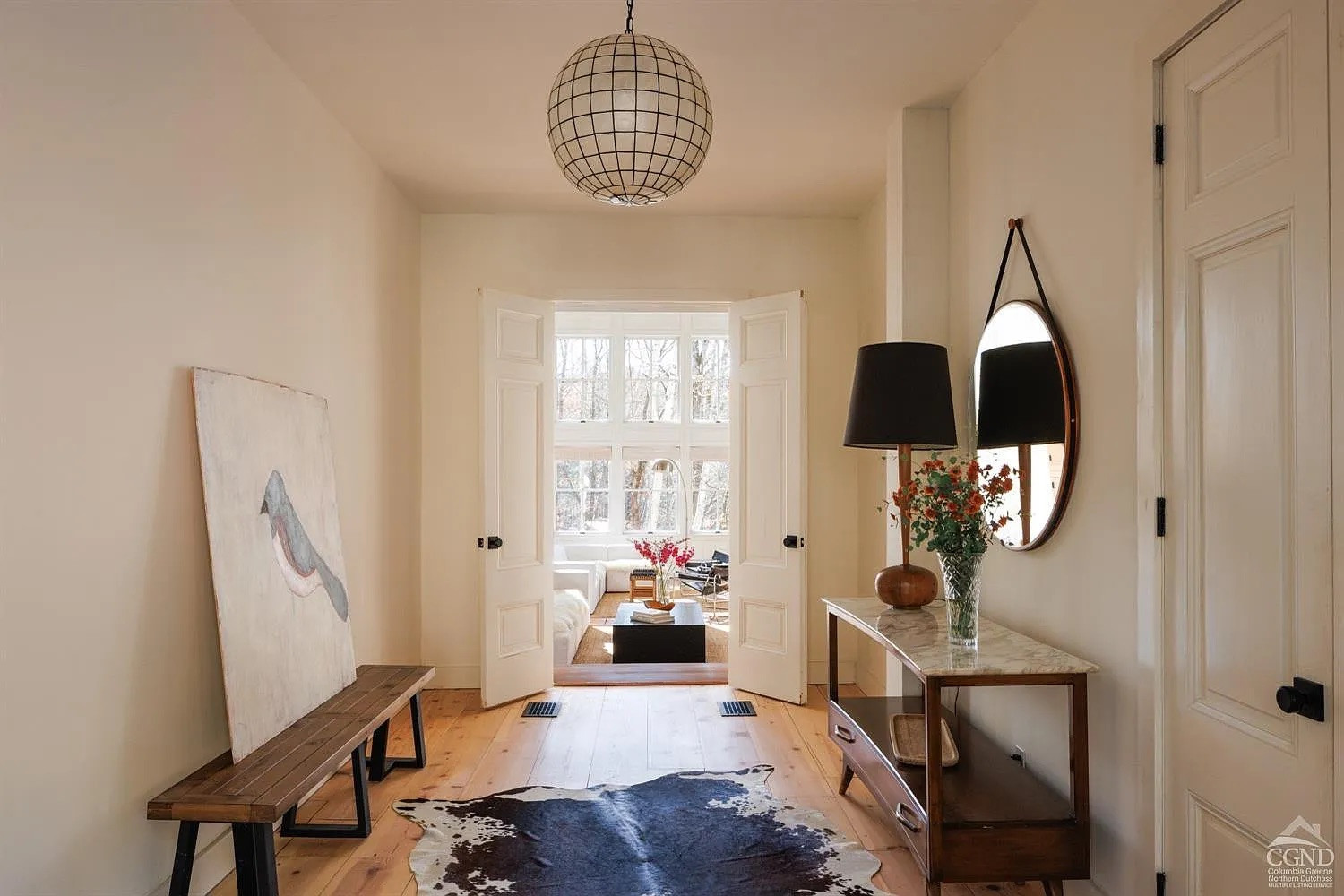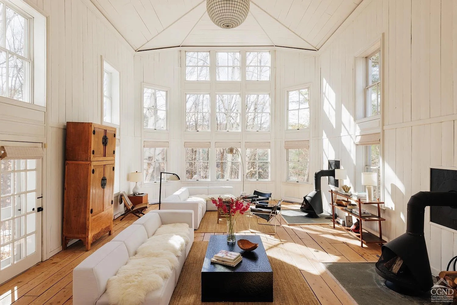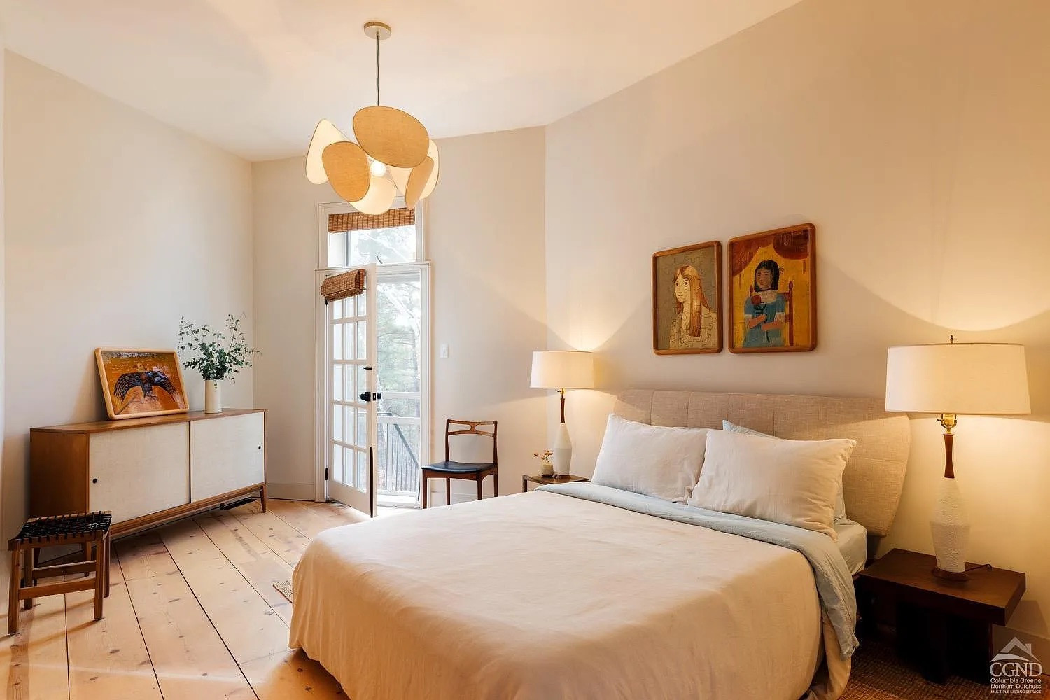 Of course, there's a great room, and of course, there are two wood-burning fireplaces framing the space. Light comes in from a wall of glass that takes advantage of the landscape, and French doors open out to the terraced patio and woodland/pondside views. There are five bedrooms and six bathrooms, a chef's kitchen with a 48-inch oven range, a dining room and parlor, and an interesting wrought-iron staircase (plus matching wrought iron window bars) that leads to the primary suite. That suite has a sitting room, fireplace, spa-like bath, and a private balcony with sweeping views. This estate is about 20 minutes from Hudson and the Berkshires, so it's easy to get to cultural attractions and great food.