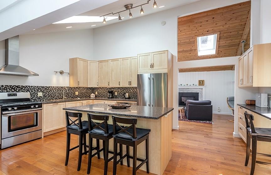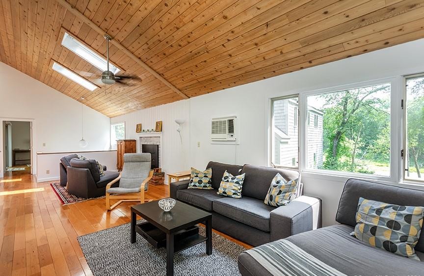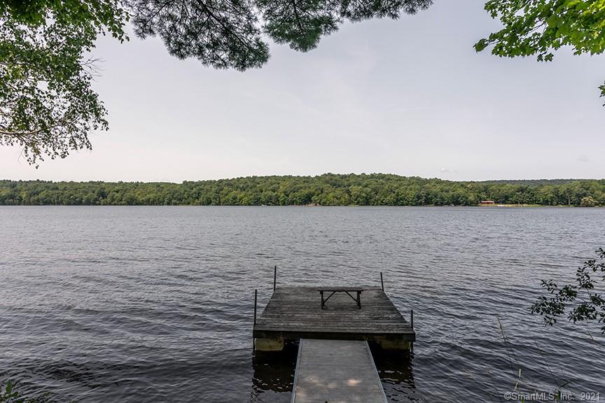 Sitting beside Long Pond Lake in Lakeville, this three-bedroom, three-bathroom house features a lakeside dock and picnic area. It has a vaulted living room, eat-in, renovated kitchen with access to the deck, and main floor primary bedroom suite with its own sitting room and a dressing area. There is a one-car attached garage and a separate two-car garage building with storage above. Listed at $849,000 by Klemm Real Estate.