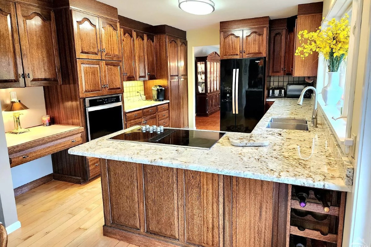 Approach the 16-acre property in Old Chatham via a winding quarter-mile driveway. The house features four bedrooms and three bathrooms, a new kitchen, refreshed bathrooms and an open floor plan. There is a tennis court, 40-foot pool and spa, plus a sauna, and an oversized three-car garage. Listed at $1,050,000 by Berkshire Hathaway Home Services Blake Realtors.
