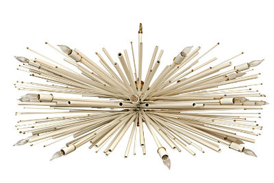Browsing the high-end antique haven of Hudson NY can make shoppers feel as though they are lost in time. What’s old is new again and beautiful art objects pulled from a thousand different moments in history exist together alongside designs right at the cutting edge. At Ad Lib Antiques, 522 Warren Street, owners Lou Blass and Don Friday (pictured left and right) are a case study of this town's stylistic "theory" of relativity. The shop is mostly filled with their refined taste in classical design, but scattered throughout the collection of antiques are explosions of truly unique new forms, objects that seem like they could exist in a multitude of moments, past and future. These are chandeliers, lamps, sconces, tables, and sculptures that are all originals, created by Blass over just the past two years, that range in influences from Mid-century Sputnik ($3,400) and 70’s metallic flamboyance (at bottom, $6,800) to, more recently, futuristic pieces, chaotic and skillfully organized sections of metal piping mixed with elements like glass orbs, flowing copper sheets, and unique bulbs. Light loves them yet is always being tricked, not knowing where it’s off to next. (An example below right, $10,000). The material is hard but the angles and light refraction created by a chandelier can feel very natural, in the way a supernova or the construction of a molecule is natural.