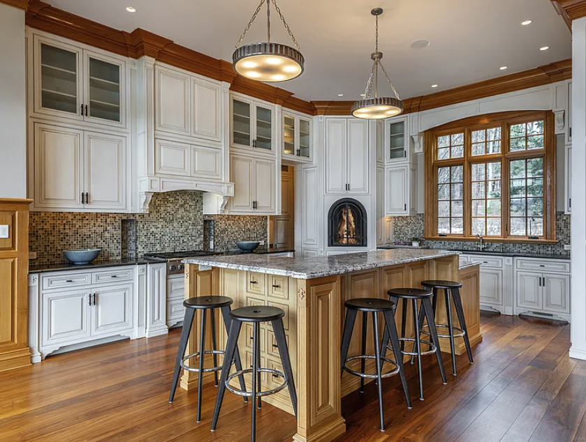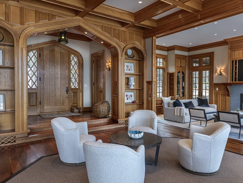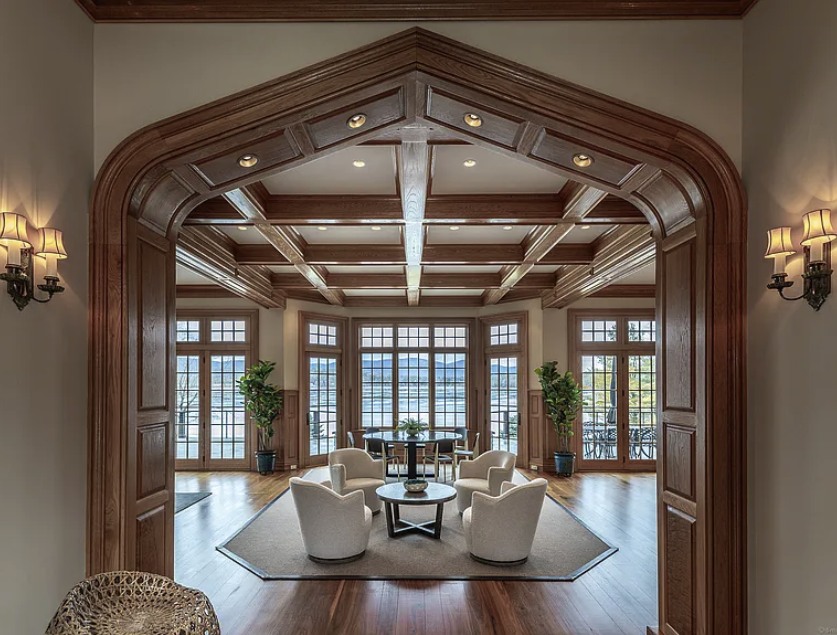 The expansive Great Room serves as the heart of the home, featuring walnut floors, oak paneling, and a coffered ceiling that exudes craftsmanship. A floor-to-ceiling stone fireplace adds warmth and character, while large windows frame the tranquil waters of Twin Lakes.