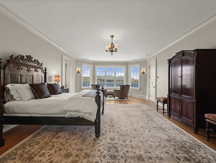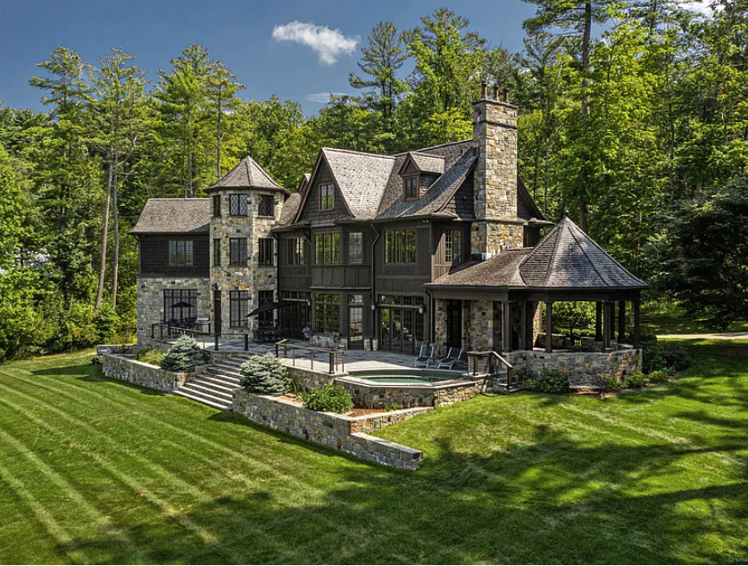 Situated on 2 acres along the serene shores of East Twin Lake in Salisbury, Connecticut, this Adirondack-inspired castle masterfully combines rustic charm with modern luxury. Built in 2009, the 6,100-square-foot home offers four bedrooms and six-and-a-half bathrooms, all thoughtfully designed to maximize the breathtaking lake views.
