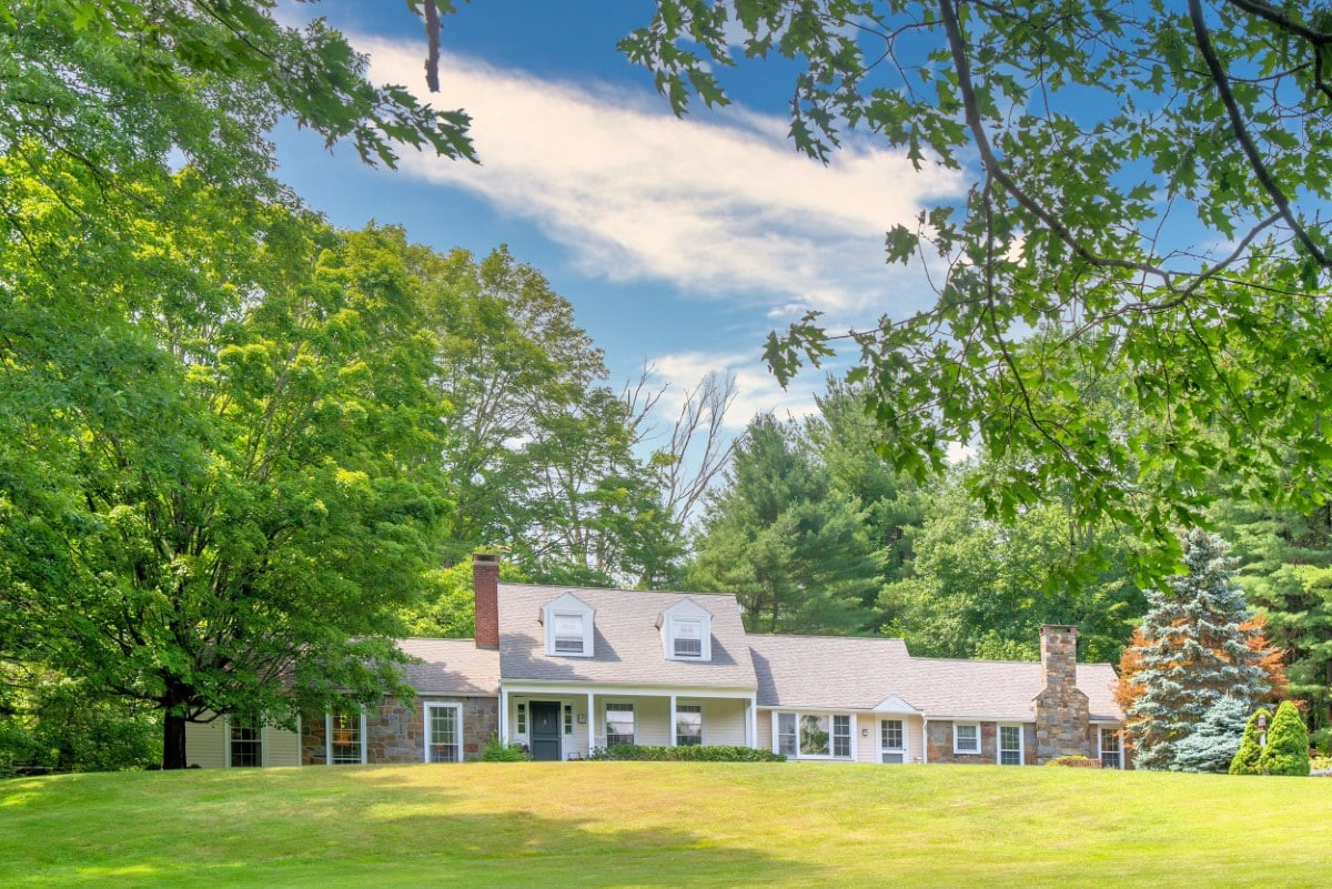 This property in Lakeville sits on six-plus acres. There are four bedrooms and four bathrooms, entertaining spaces with two fireplaces, and a stone patio. Addiitonal rooms include a library/den, and a sitting room in the master suite. The two-car garage has a separate heated studio. In the winter, there are views to the lake. Listed at $1,795,000 by Elyse Harney Real Estate.