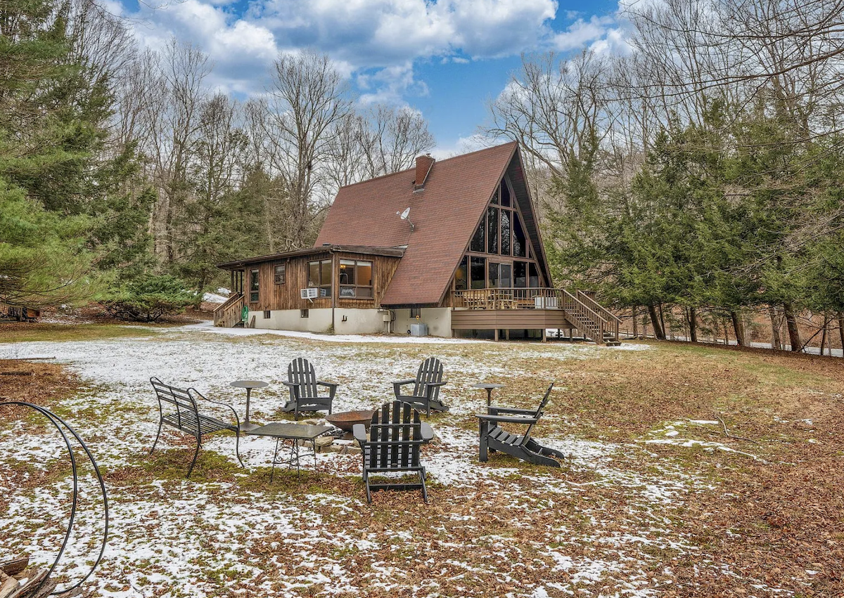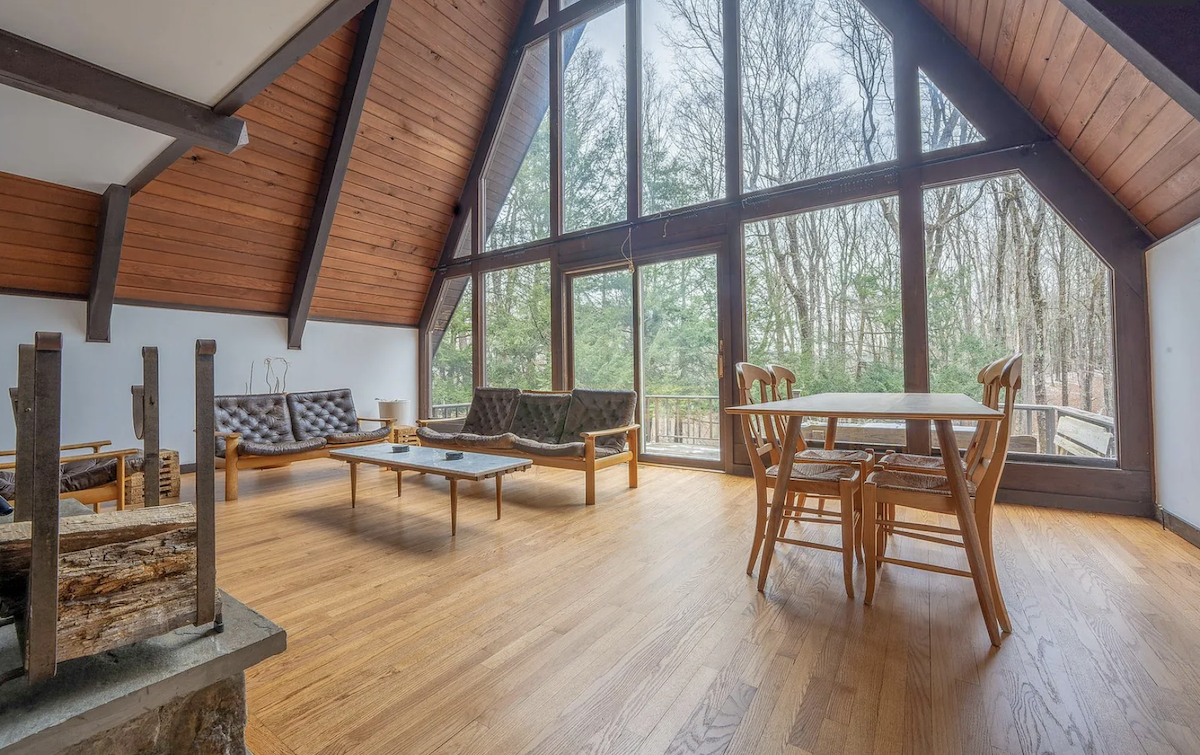 This stunning A-frame, featured in both Dwell and Vogue magazines, has country charm and mid-century modernism. Situated on six wooded acres in Red Hook, the home is just around the corner from a natural swimming hole and minutes away from the Taconic State Parkway.