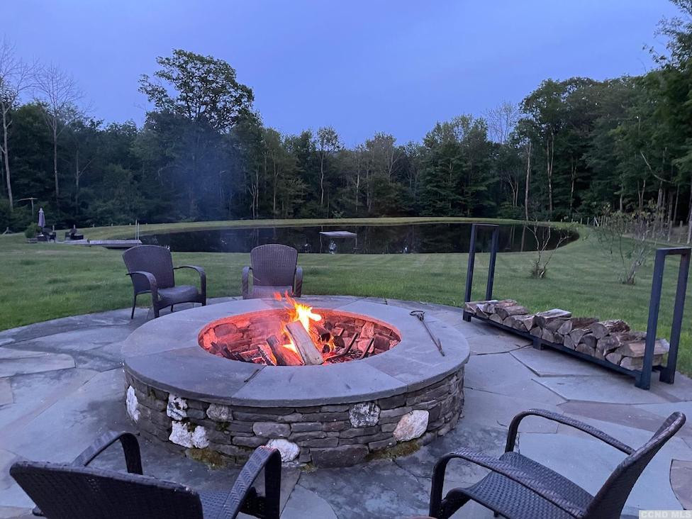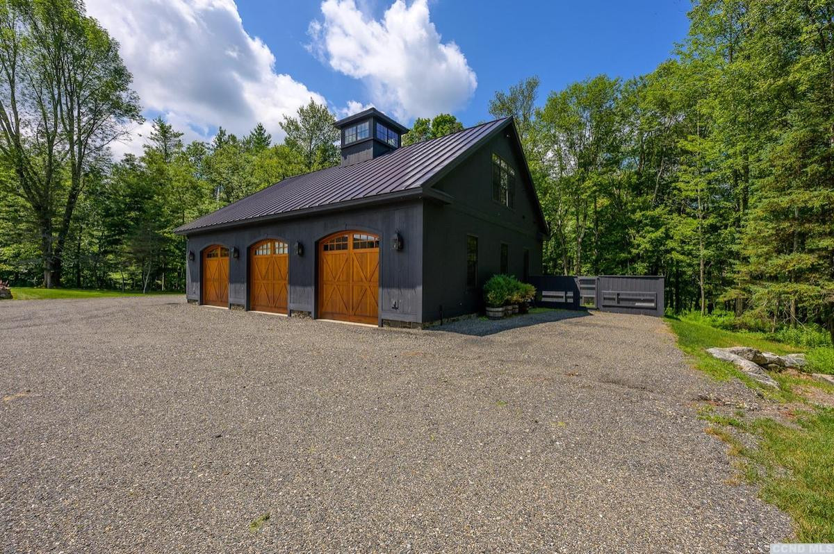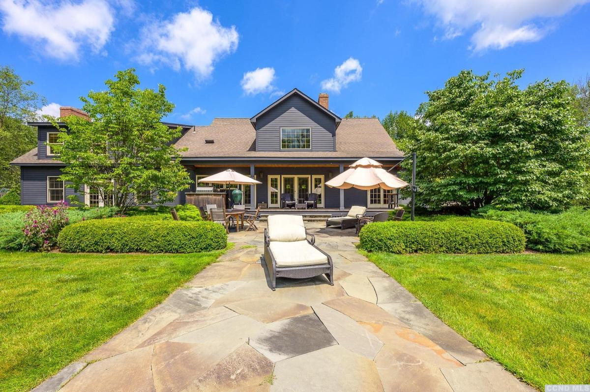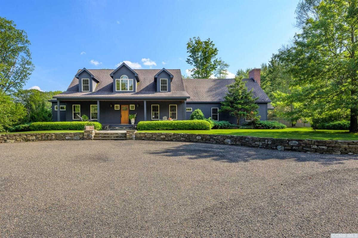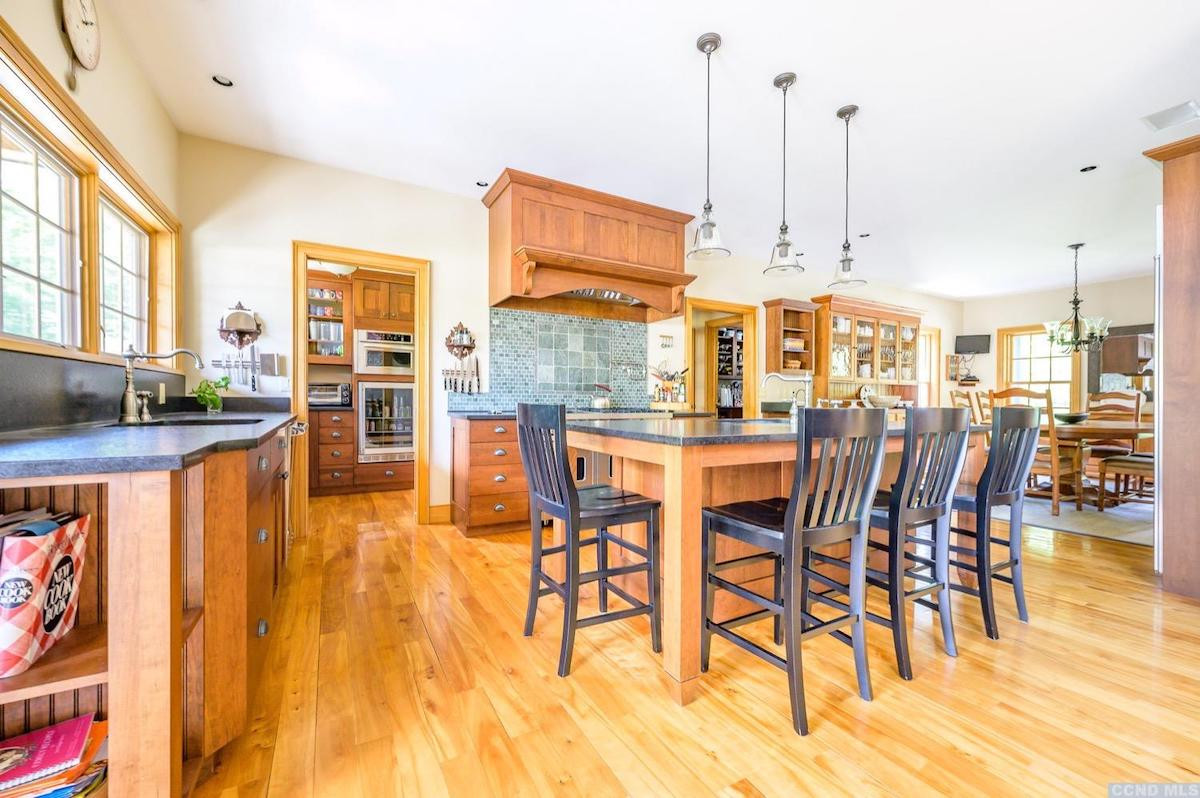 The listing deems this home an "American Basic" architectural style, but it's completely contemporary inside, and the property has exceptional features. It has four bedrooms and six bathrooms. Spacious and open, it offers a chef's kitchen and two pantries, and a finished basement. Off the back is a covered porch connecting to a stone patio with a firepit overlooking a pond with hilltop views. Listed at $1,695,000 by Stone House Properties.