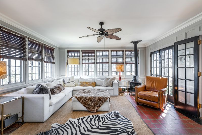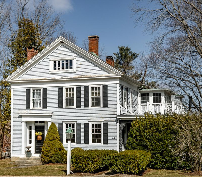 Set on over 10 acres in Goshen, this 1850 Colonial has four bedrooms and three bathrooms. The kitchen features a Garland stove, and there is a built-in banquet and butler's pantry. The large dining room offers a fireplace and the sun room has a wood stove. The master bedroom has its own balcony. Listed at $1,095,000 by Klemm Real Estate.