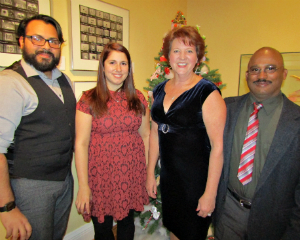 Cassey Santos-China and Sharon Smith of Kimball Farms make the opening party an annual event; Berkshire County Arc staff pose in front of their tree: Jose Taveras, Morgan Jasewicz, Crossroads Center director Donna Williams and her husband Michael Williams.