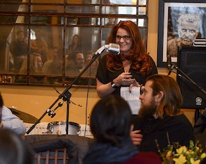 Matteline deVries-Dilling, founder of Lite Brite Neon, one of the evening's honoree of this year's Upstate Benefit adresses the gala from the Caboose's caboose.