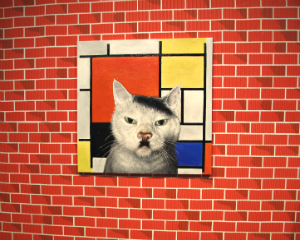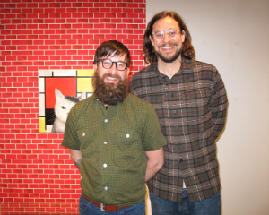 Amy Krzanik reports from Great Barrington. The Hillman-Jackson Gallery at Bard College at Simon's Rock is a forward-thinking, eclectic gallery at an equally forward-thinking and eclectic school. The Gallery’s current exhibition, Animalia, featuring the most recent work by painter Michael Caines, opened with an artist’s talk and reception on Monday, April 20. Caines collaborated with designer Sean Naftel to hang the show, which features paintings of dogs, cats — including one with a mustache — and humans which “slyly reference 17th-century portraiture, historical landscapes and minimalist painting." The “star" of the show is Georgeous – a portrait of a dog with George W. Bush’s eyes and mouth — positioned low to the ground and behind tiny velvet ropes as if it were the Mona Lisa. You can catch the exhibit, downstairs at the Daniel Arts Center, through Thursday, May 14. Above, Ariana Taylor, Michael Caines and Sean Naftel.