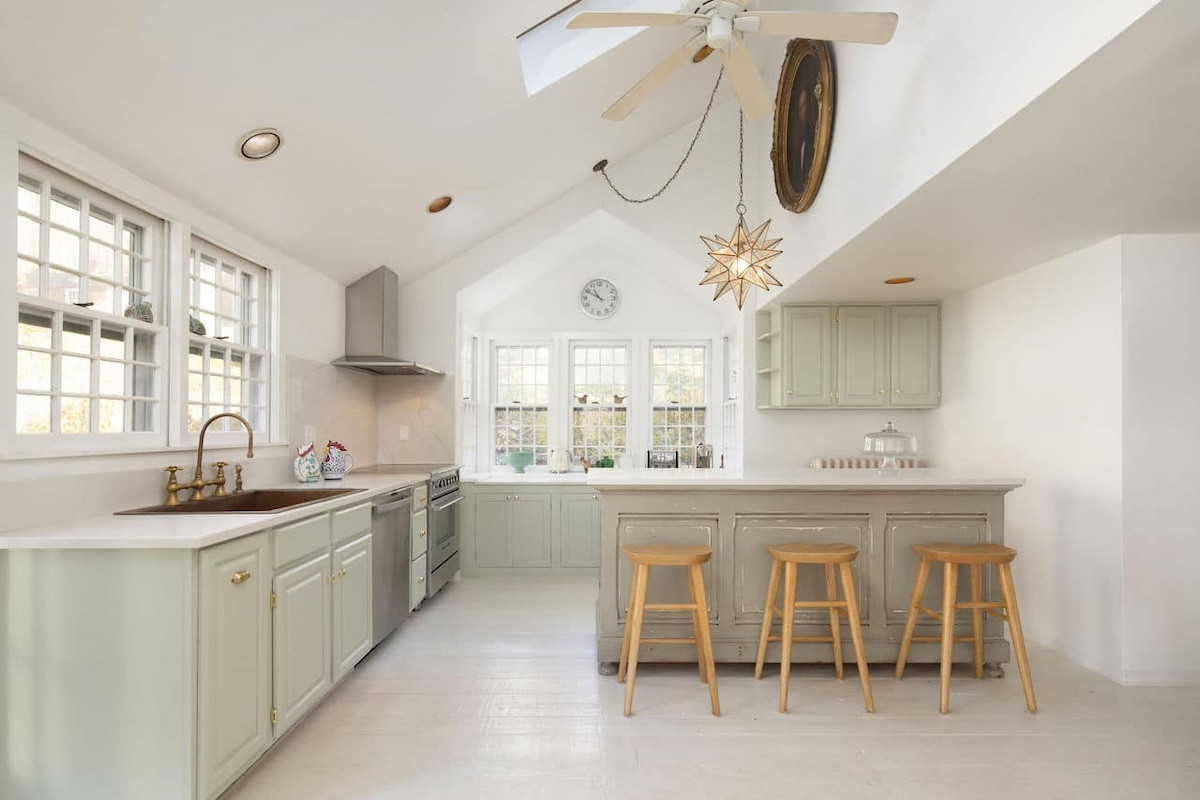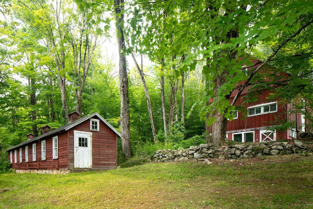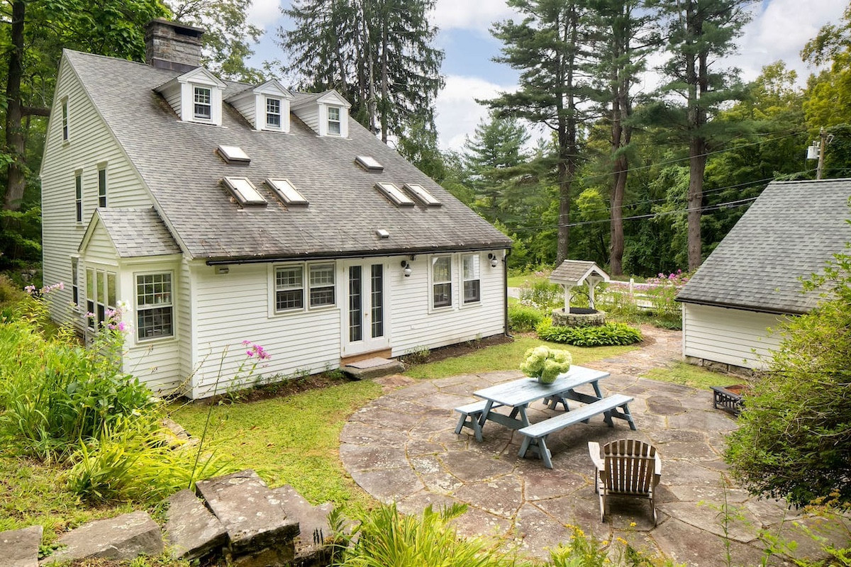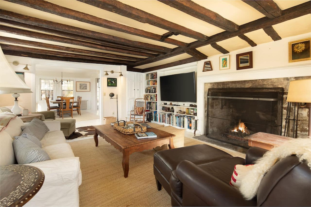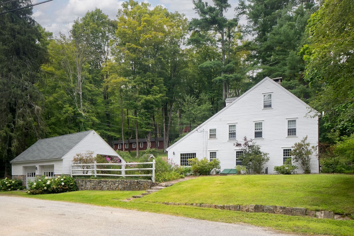 Nestled in the hills of Cornwall, an antique three-story Saltbox-style home has four bedrooms and four bathrooms on 10 acres. The property includes two barns, stone walls. An updated kitchen offers an antique island and copper farm sink. The primary suite features a wood-burning fireplace and open seating area. Listed at $1,365,000 by Elyse Harney Real Estate.